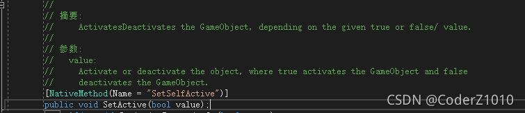 在程序运行过程中用代码显示、隐藏物体则需要用到GameObject类中的SetActive函数: