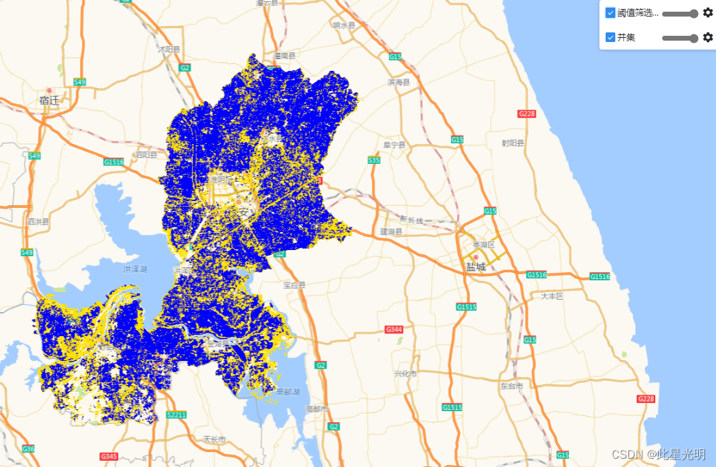 Map.addLayer(thersold, visParam, '阈值筛选后结果')