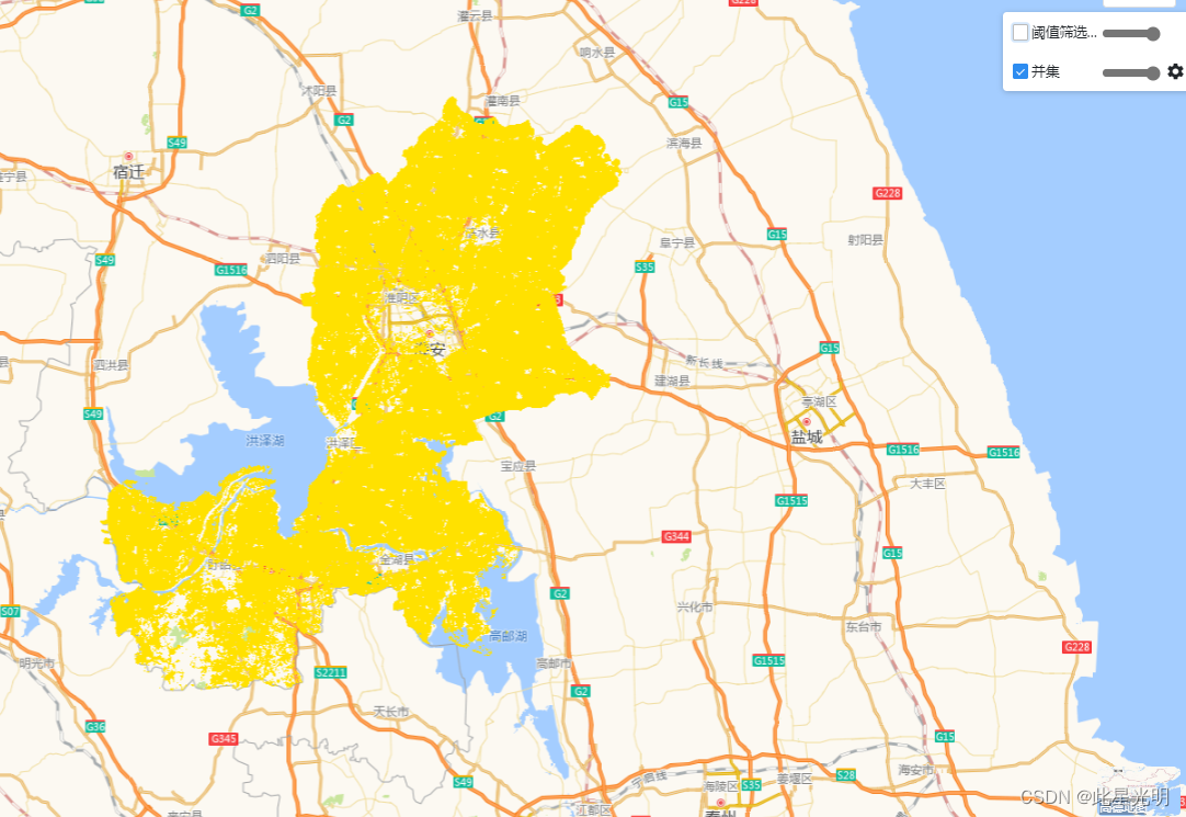 Map.addLayer(symmetricDifference, { min: 0, max: 1, palette: '00FFFF, FFE100' }, '并集')