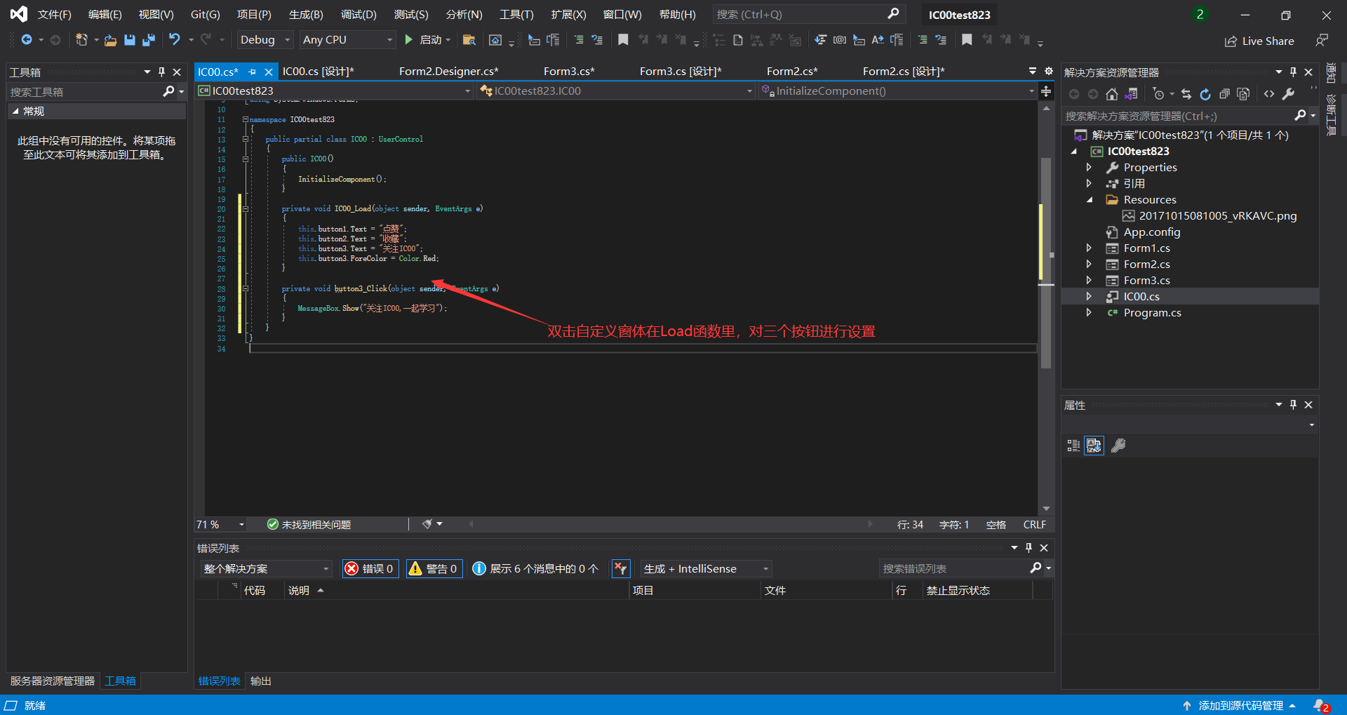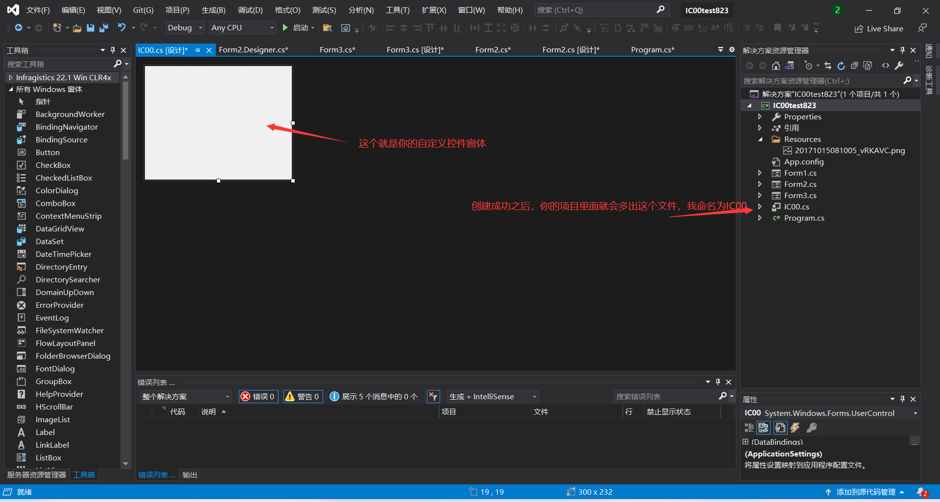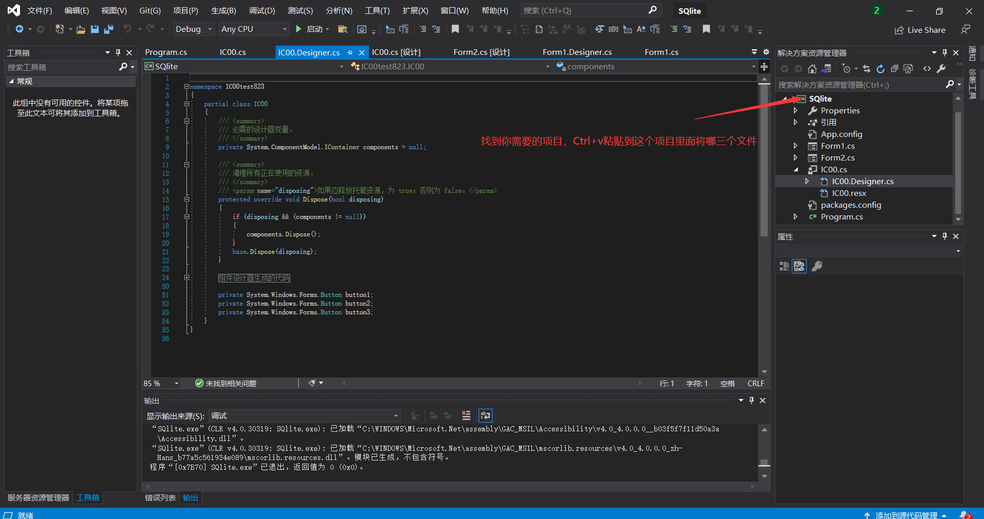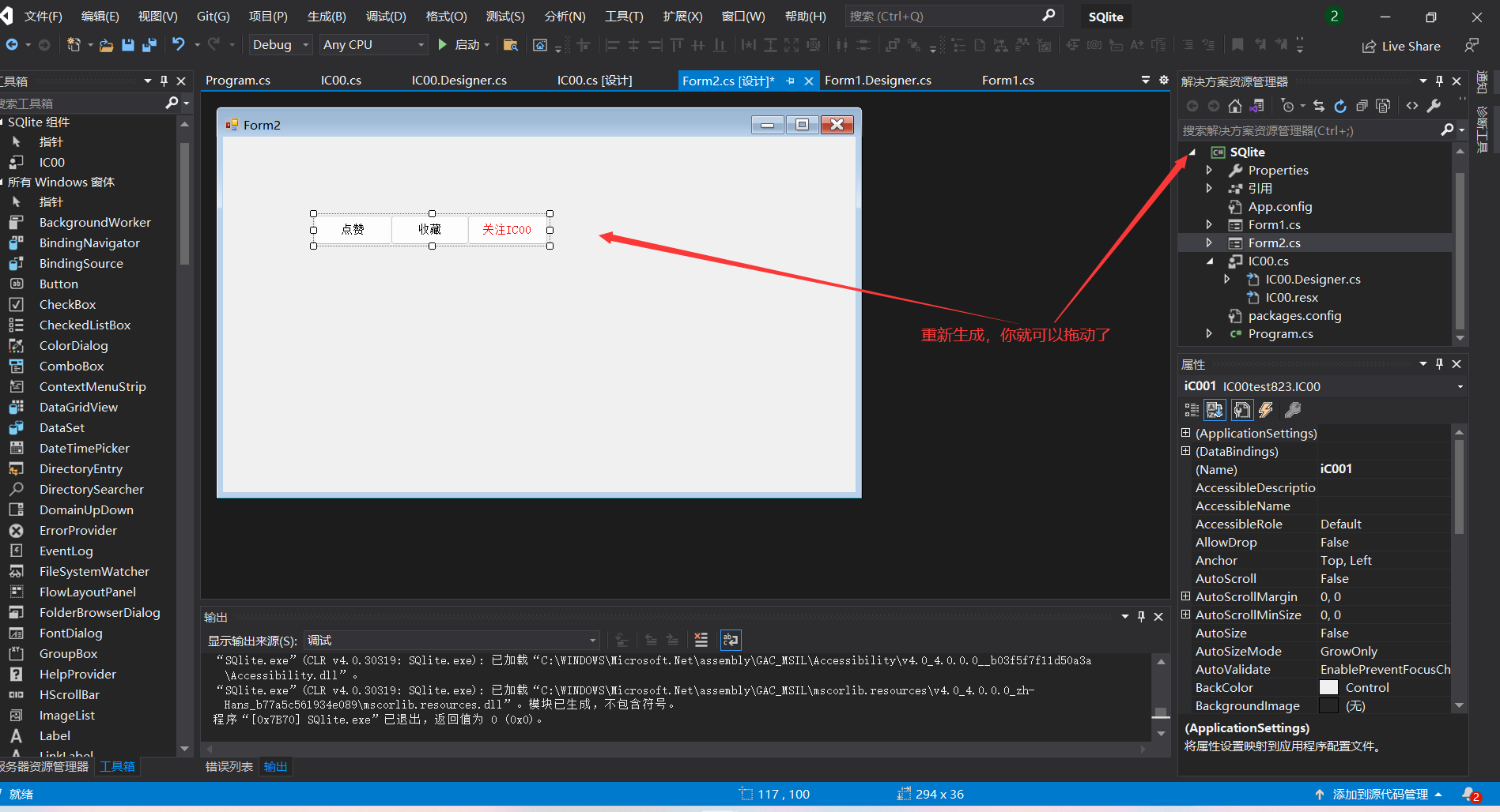 注意:如果你粘贴之后生成不出来,记得改namespace ,记得改命名空间,就是自定义控价里面的代码的namespace 是之前的,你要改成你现在这个项目的,我的这个是namespace SQlite;