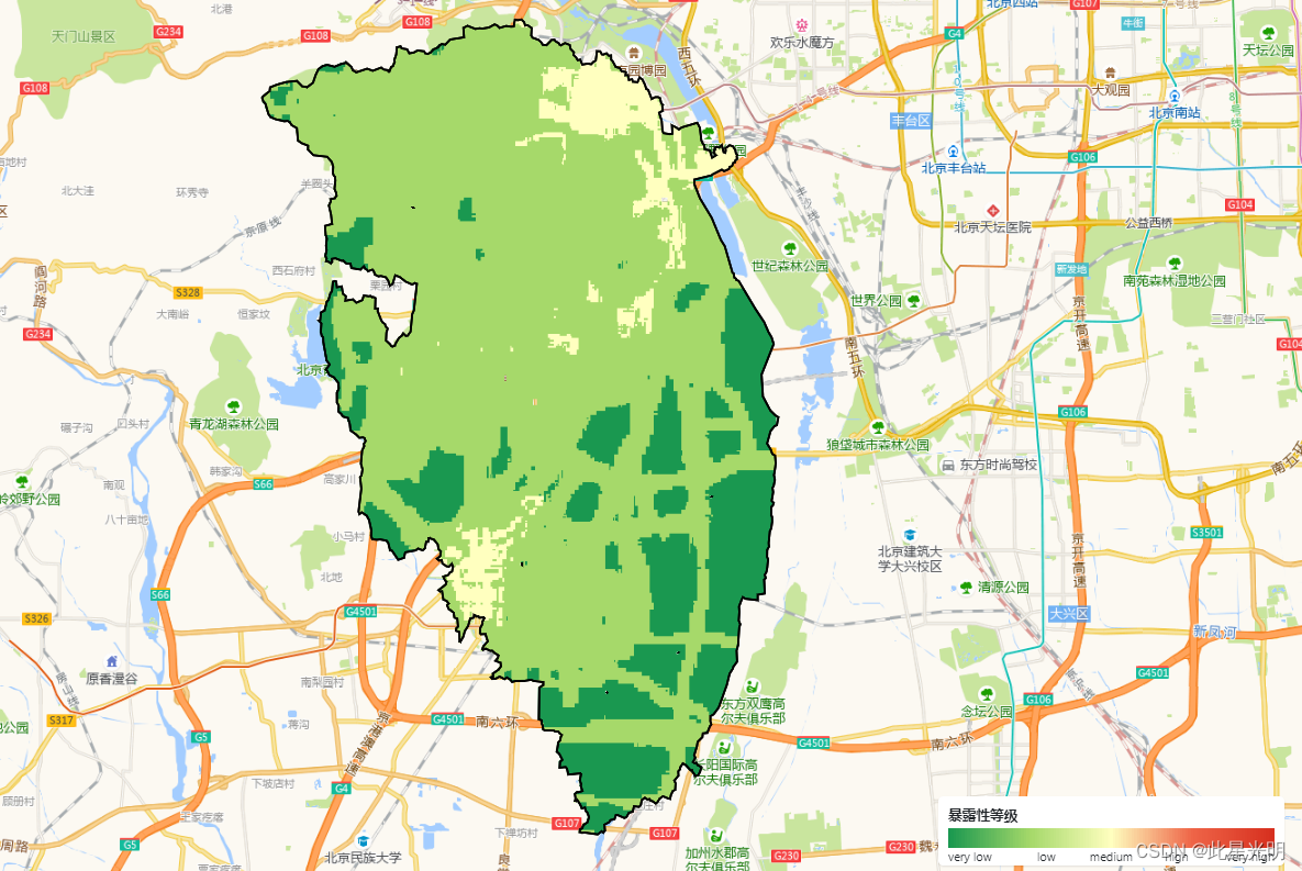 房山区洪涝灾害风险评价这个可以说不是一个APP,要改进的话可以通过UI控件设定来在MAP上完成,剩余的其它部分都可以实现在,这里灾害风险评价时暴露性结果统计与展示、脆弱性结果统计与展示、危险性结果统计与展示以及洪涝灾害风险结果统计与展示。代码的整个流程主要是受埃希纳加载研究区和数据,然后对DEM、slope、降水强度等进行归一化处理,在这里的每一个归一化处理中,都会通过获取min和max然后通过归一化公式来获取。