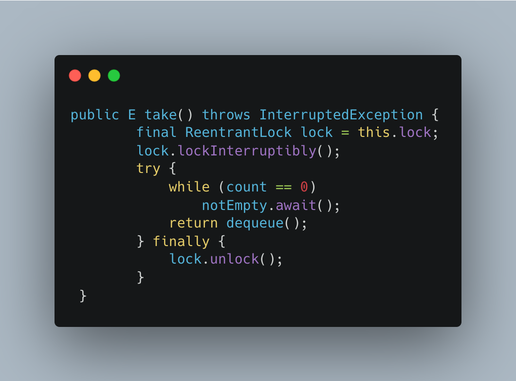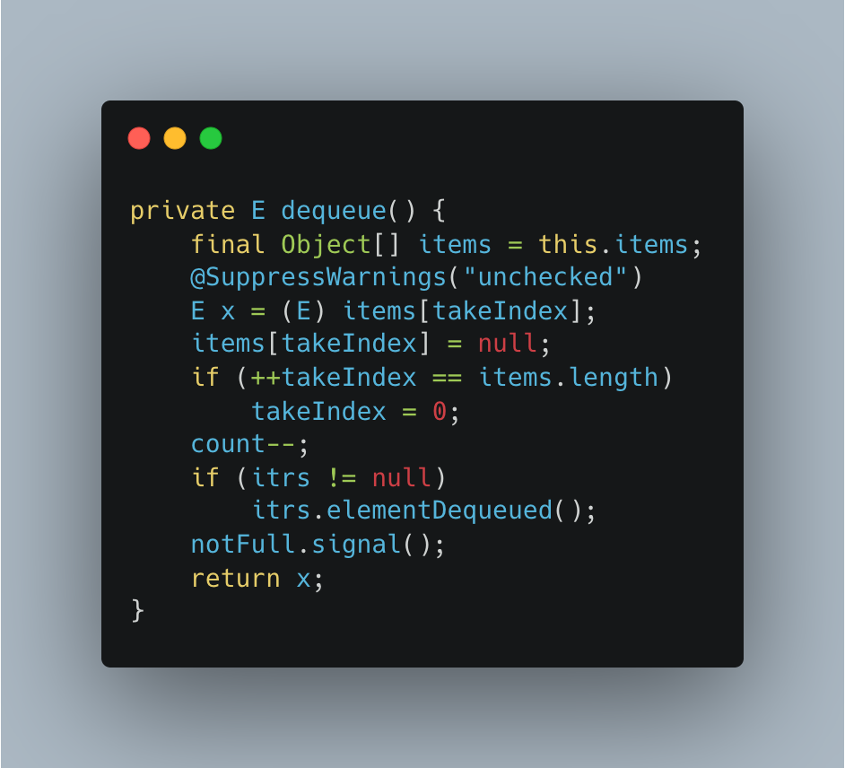 逻辑和put()方法总体上差不多,判断count是否为0,如果为0,阻塞等待,否则调用dequeue()方法,dequeue()方法的逻辑又和enqueue()方法差不多