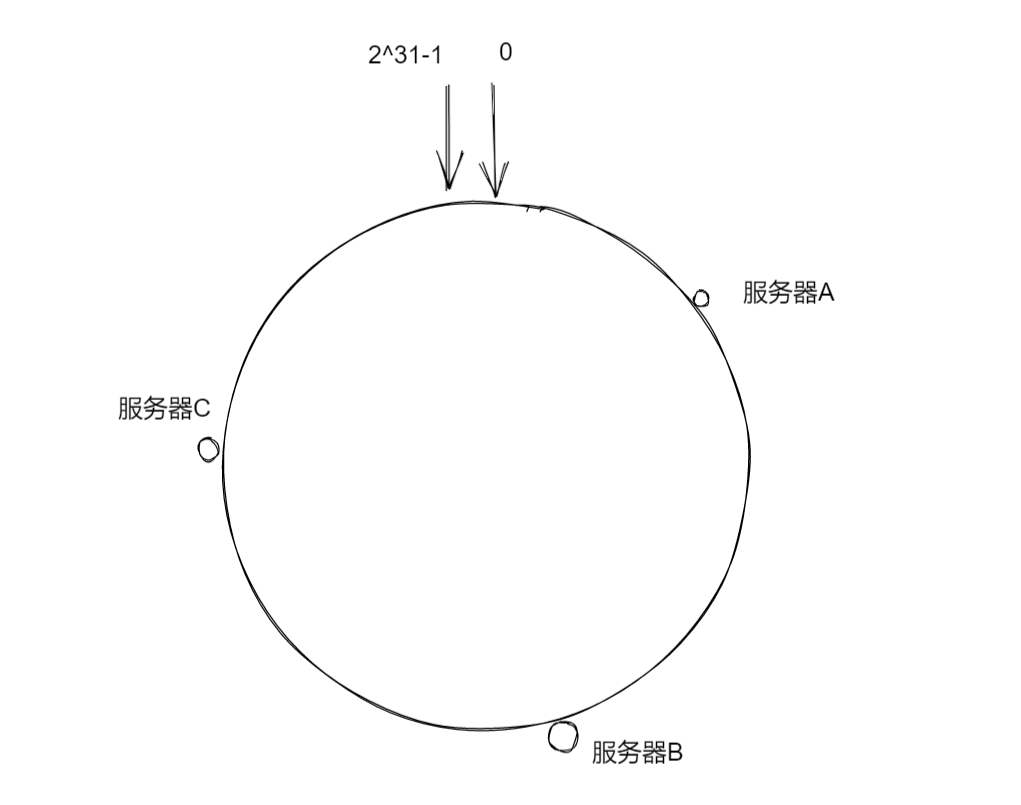 多个服务器都通过这种方式进行计算,最后都会各自映射到圆环上的某个点,这样每台机器就能确定其在哈希环上的位置,如下图所示。