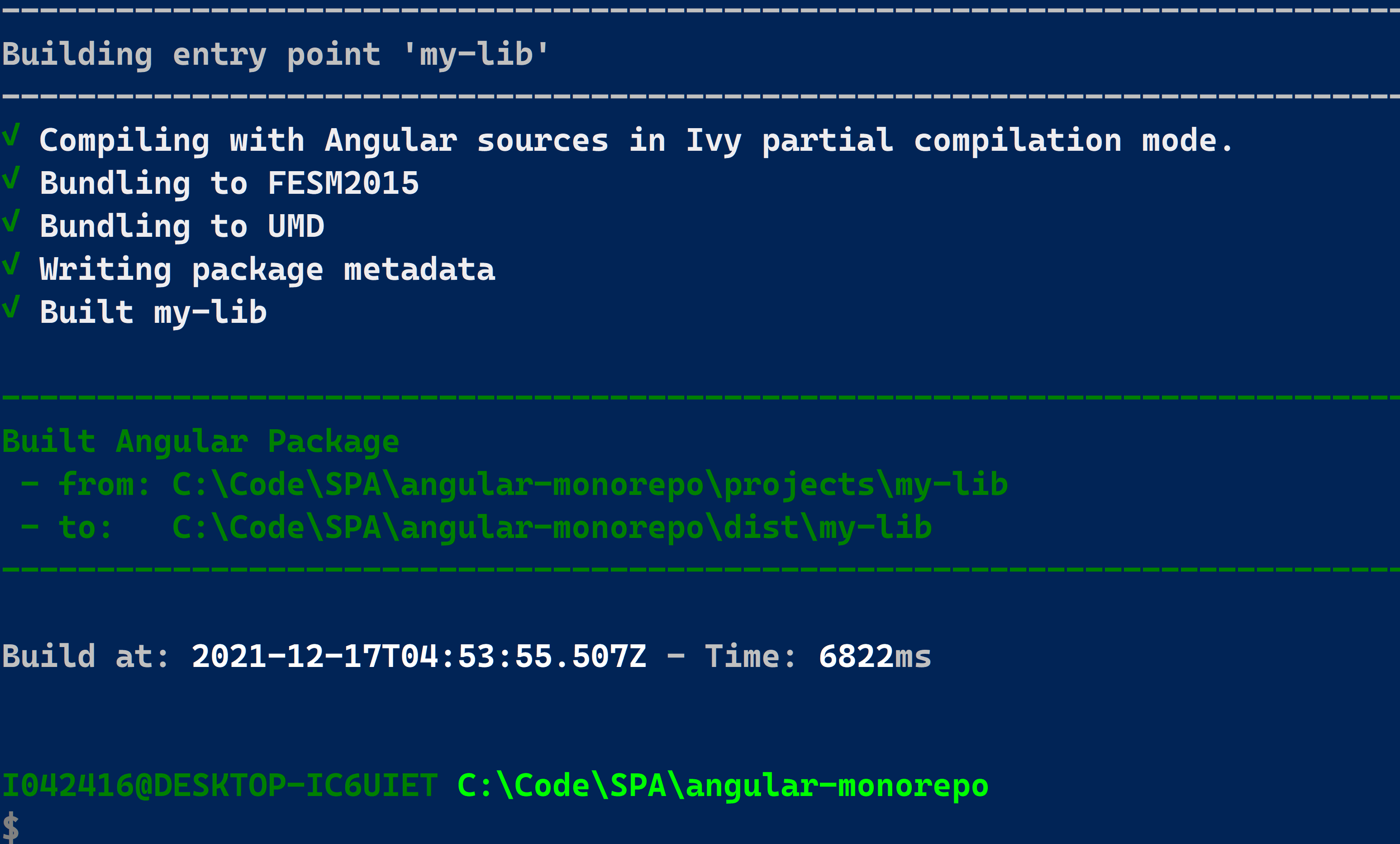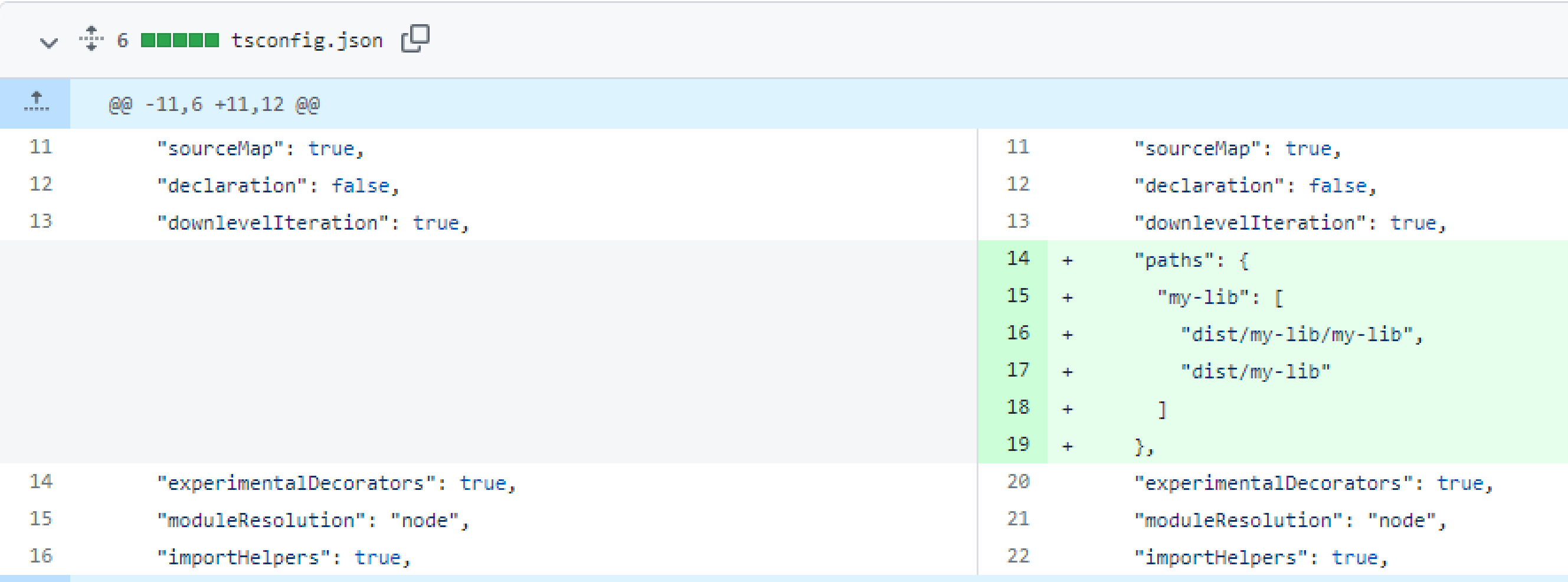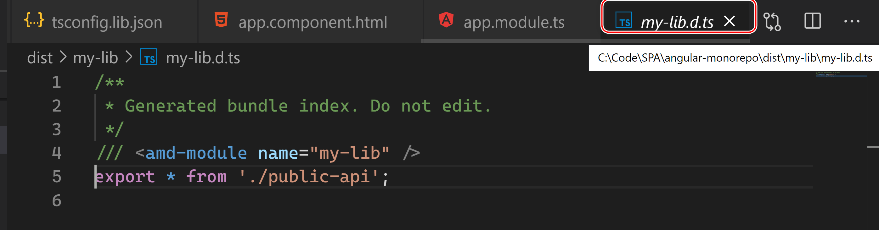 在工作区的 tsconfig.json 文件里,自动在 paths 里添加了 my-lib 到磁盘上物理文件的映射关系。这样,ng build 时,看到 my-lib 的 symbol,就会到 dist/my-lib 文件夹里查找类型定义: