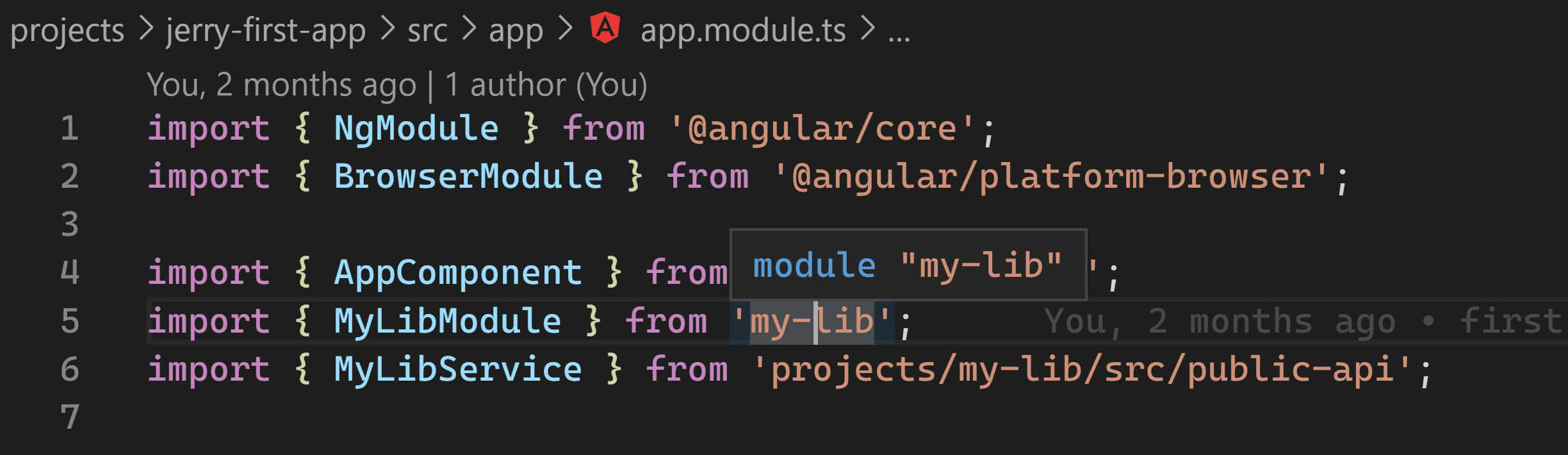 我们在 Visual Studio Code 里查看 my-lib,鼠标 hover 上去,能看到 module “my-lib” 的提示:
