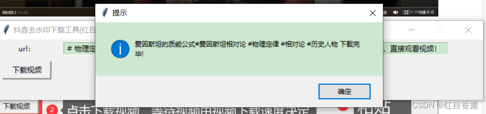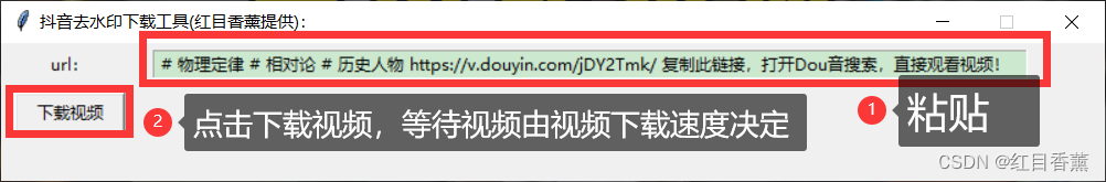 直接粘贴就行,点击下载,下载的时间根据视频的大小决定,过程中可能会出现没有响应的情况,别担心,等一会就好了,我没有单独创建一个下载进度的线程,比较麻烦,又没有现成的就懒得弄了。