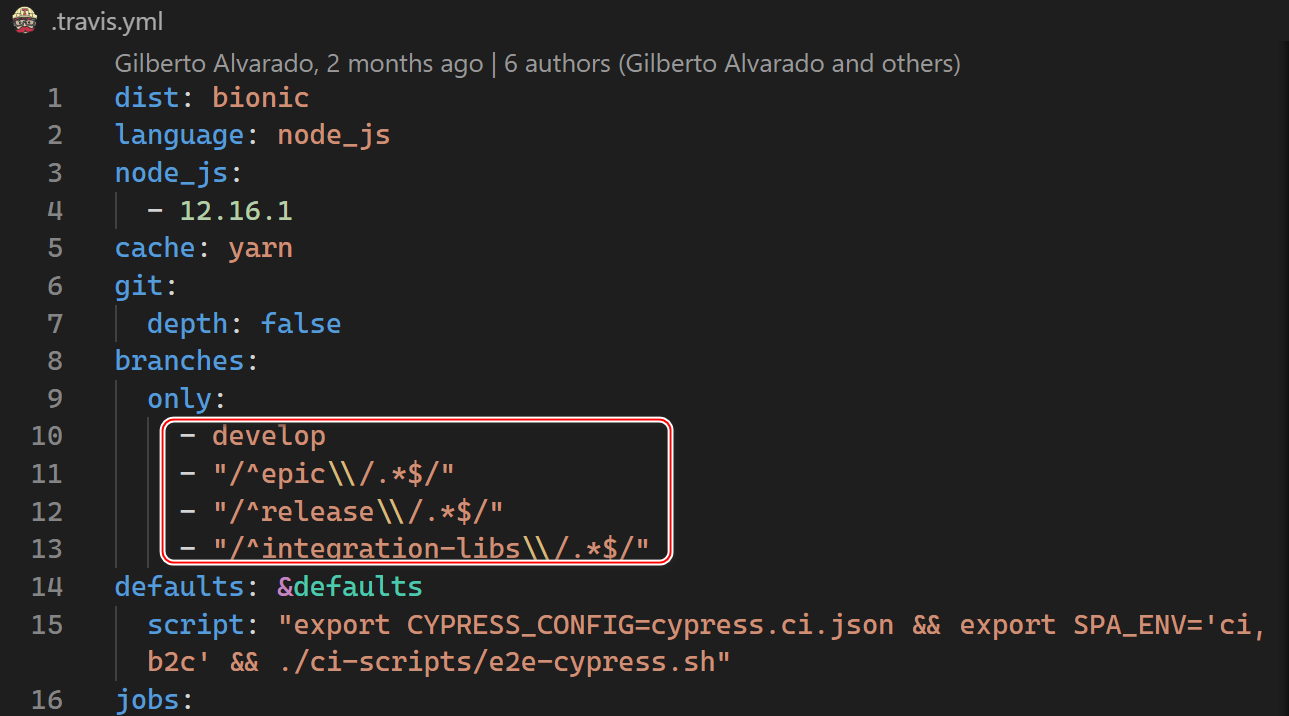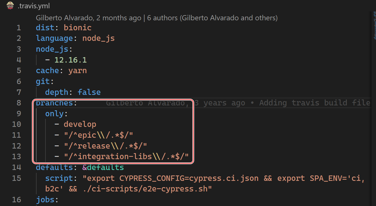 又比如 branches 关键字和 only 的组合,下列例子的语义是,仅当 develop, epic, release, integration-libs 等 分支出现代码提交时才触发 Travis.
