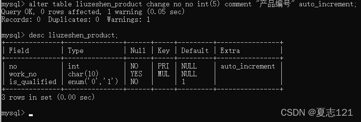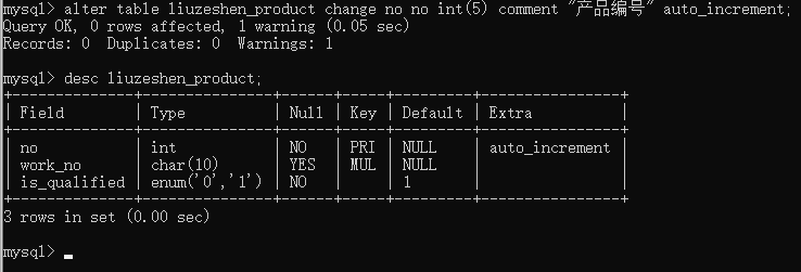 观察表中数据发现产品编号应该用整数类型,并且设置自动增加,所以你修改了产品编号字段的数据类型,并查看了产品表的字段信息