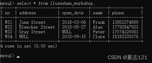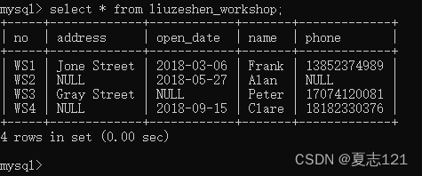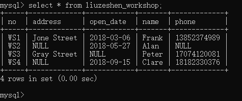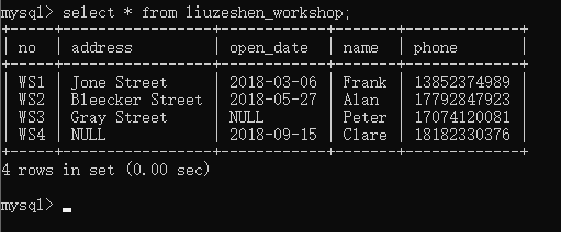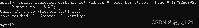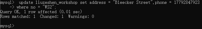 此时秘书打来电话说WS2车间的地址在Bleecker Street,主任的联系方式是17792847923,你修改了车间表中WS2车间的地址和主任联系方式
