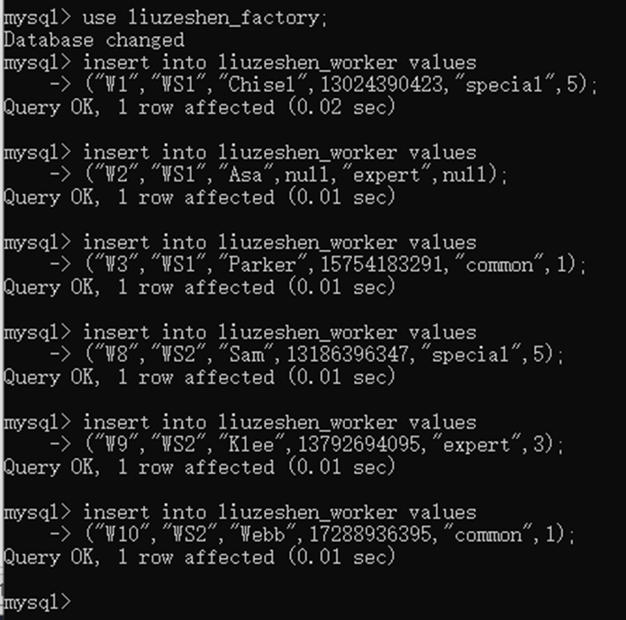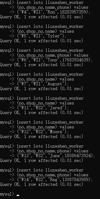 之后使用指定字段批量插入数据的方式开始往职工表新增这些被标红的八条数据,在新增时不用指定工种、工龄字段