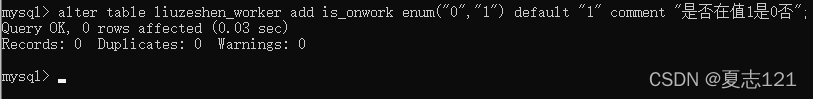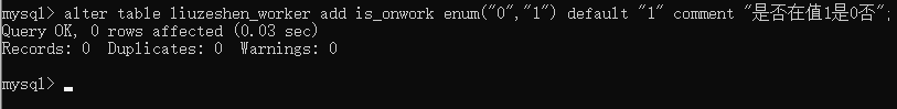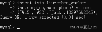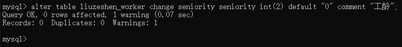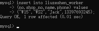 你看到工种、工龄、是否在职都与表中设置的默认值相同,故使用指定字段添加数据的方式插入了这条数据,只指定了工号、车间号、职工姓名、联系方式字段