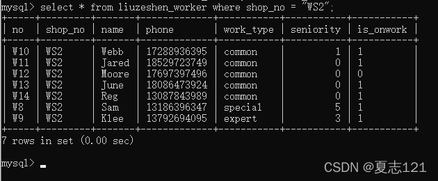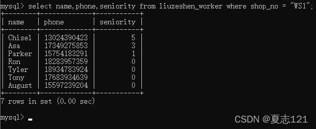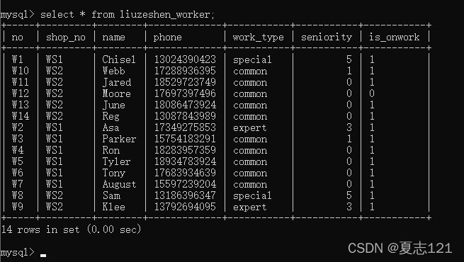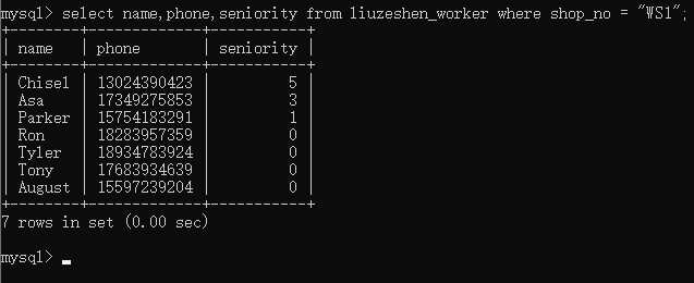 之后查询车间表中WS1车间的职工姓名、联系方式、工龄字段信息