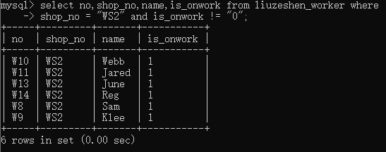 你用查询语句查询了职工表中车间号为WS2并且是否在职字段为1的工号、车间号、职工姓名、在职状态字段数据