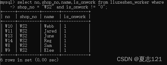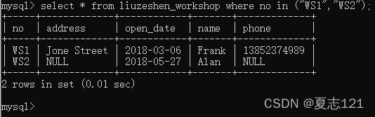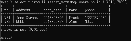 发现WS1,WS2车间均有职工联系方式不明确,这不利于管理,需要联系他们的车间主任来拿到这些员工的联系方式。所以你查看车间表中车间号在WS1,WS2里的所有字段信息
