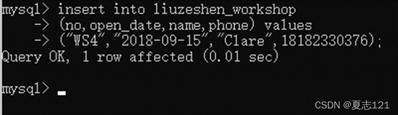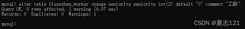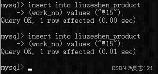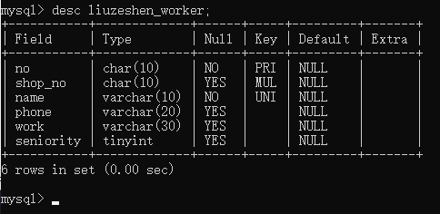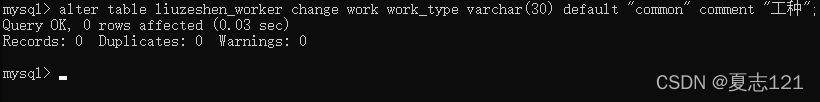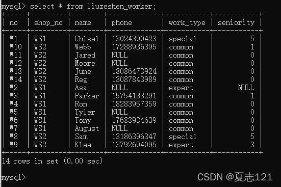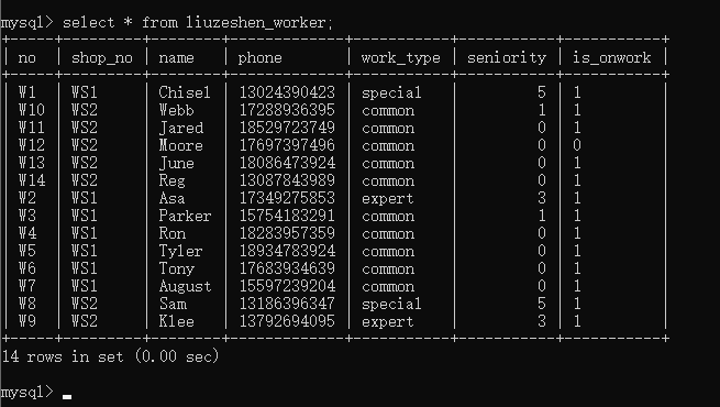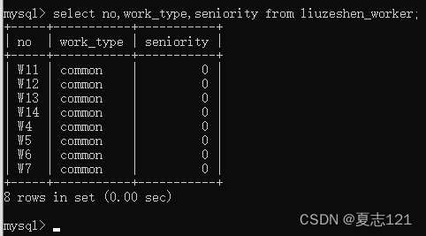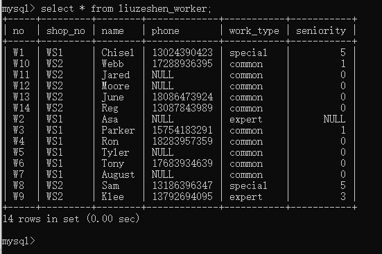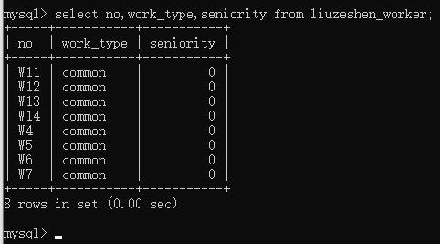 因为没有指定工种、工龄字段也就不用频繁的写“common”和0,这次新增下来你感觉自己轻松了不少,但有点担心数据库有没有自动写入默认值,所以你用查询语句查看职工表中的工号、工种、工龄字段数据