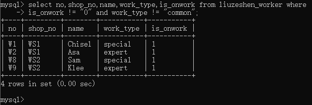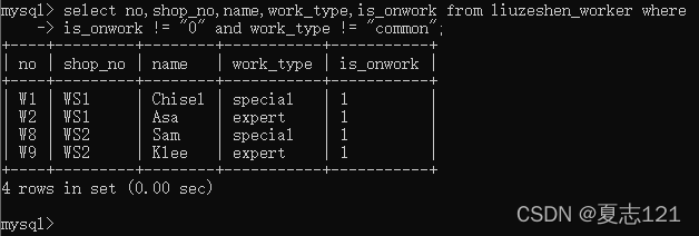 但是想到有工龄字段,你查询了职工表中工龄不等于0并且工种不是common的工号、车间号、职工姓名、工种、工龄字段数据