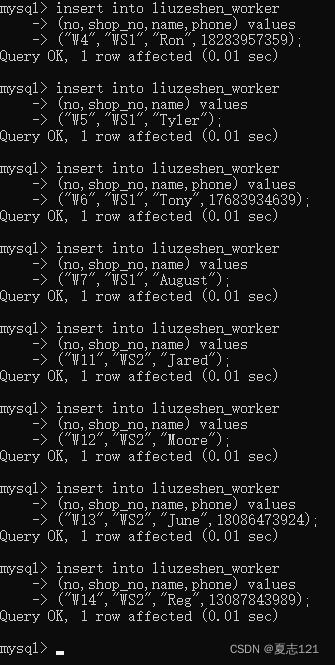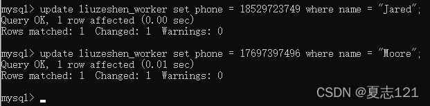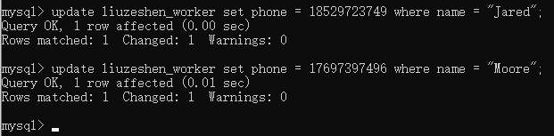 打电话给WS2车间主任,得知Jared和Moore的联系方式分别是18529723749和17697397496,你写了两条update语句来改这两条数据