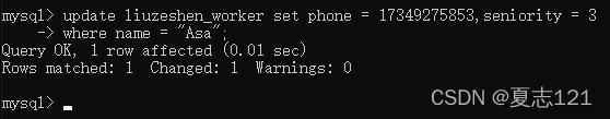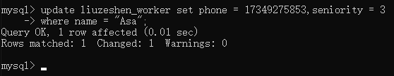 首先修改职工表中Asa的联系方式为17349275853,工龄为3年