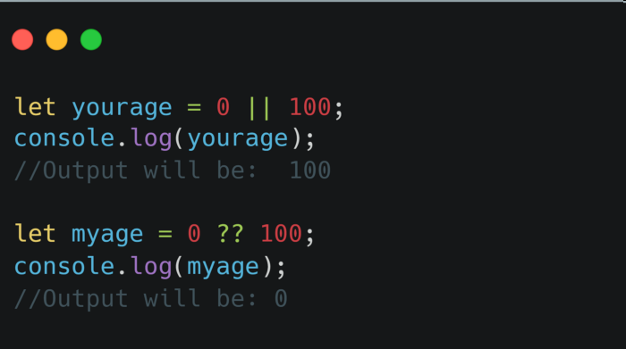 遇到 0,|| 会返回右边的操作数 100,而因为 0 既不是 undefined 也不是 null,因而 0 ?? 100 会返回 0.
