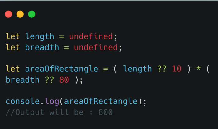 因此,正如您在上面的示例中看到的那样,返回 Hello 是因为 undefined 位于运算符的左侧。 如果 null 代替 undefined,结果将是相同的。 在第二个示例中,如果第一个参数中存在除 null 或 undefined 以外的任何内容,则操作员不会检查第二个参数,而是会立即打印第一个值。