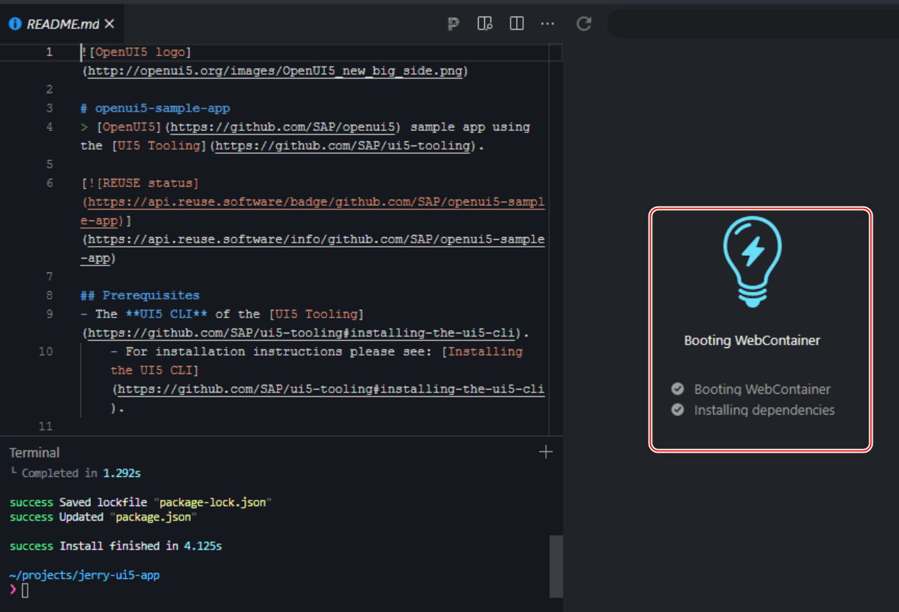 这一切归功于所谓的 WebContainer,如下图 Booting WebContainer 和 Installing dependencies 的信息:
