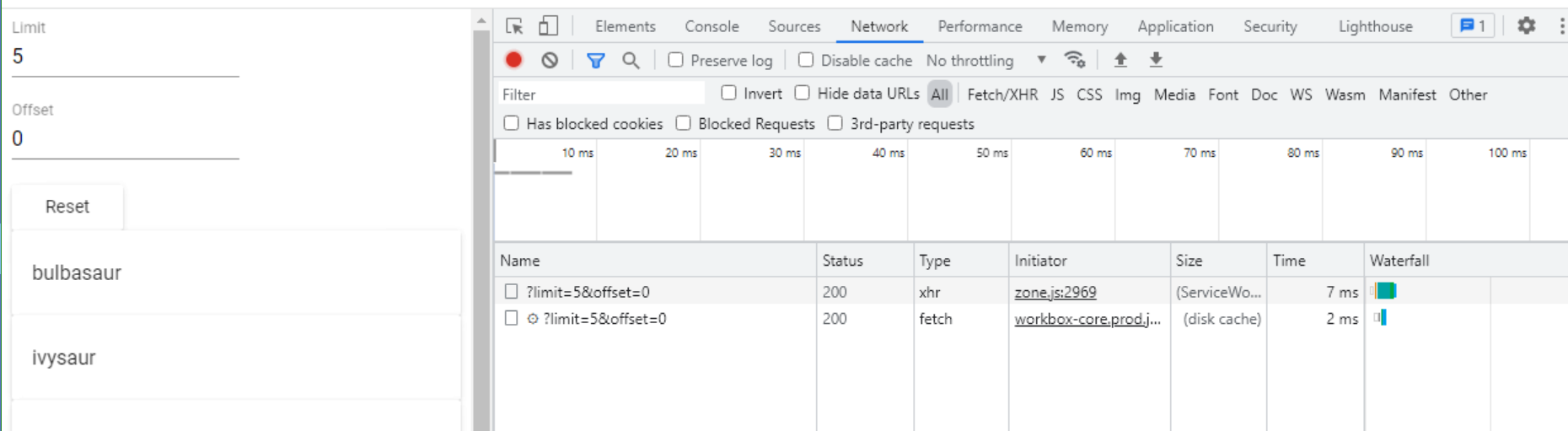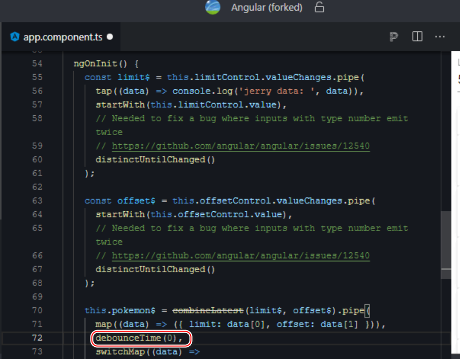 我们有一个限制值流和一个偏移值流。 我们使用 combineLatest 组合这些流以创建一个流,该流将在每次源流之一更改时具有一个新值。 然后我们使用 switchMap 根据这些值从后端获取数据以获取 pokemon$。 因为我们使用了switchMap,如果一个调用还没有结束,那么当一个新的调用通过改变limit或者offset来发起一个新的调用时,前一个调用就会被取消。