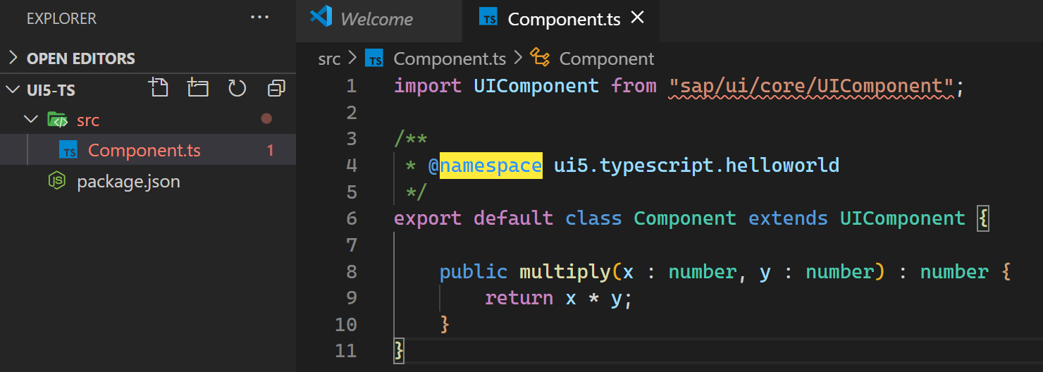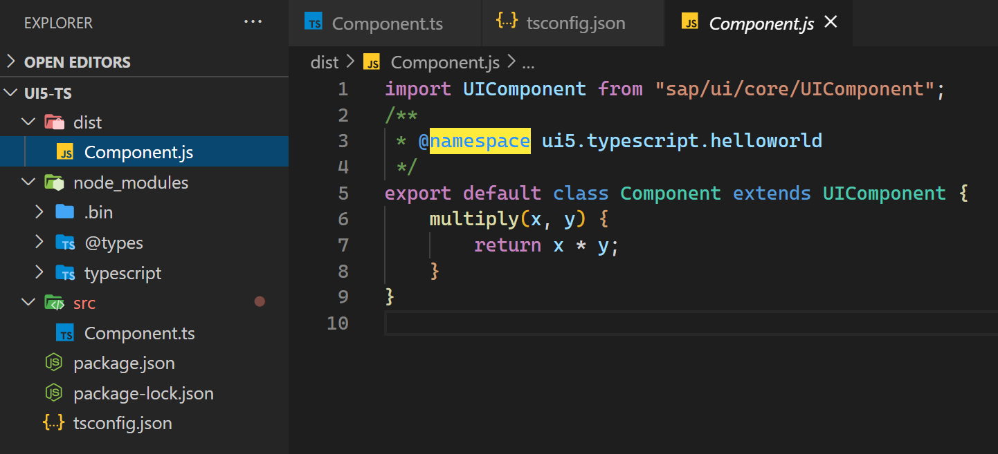它是 TypeScript 代码,这意味着虽然大部分是纯 JavaScript,但它还包含变量、参数和函数返回值的类型声明,如“multiply”方法的定义所示。 我们马上将能够看到 TypeScript 编译将如何去除这些内容。