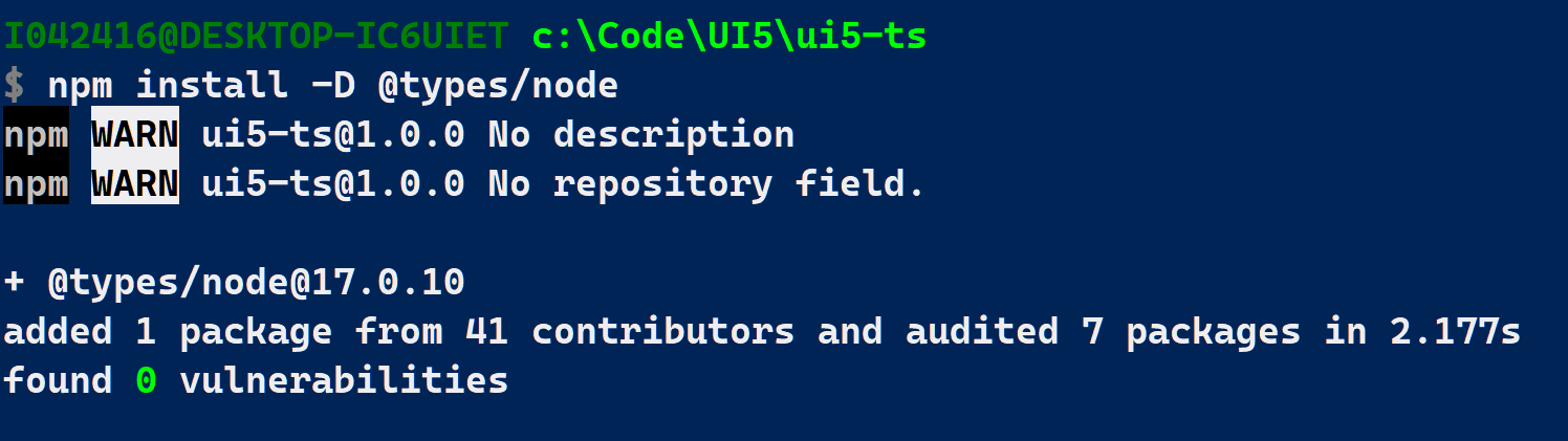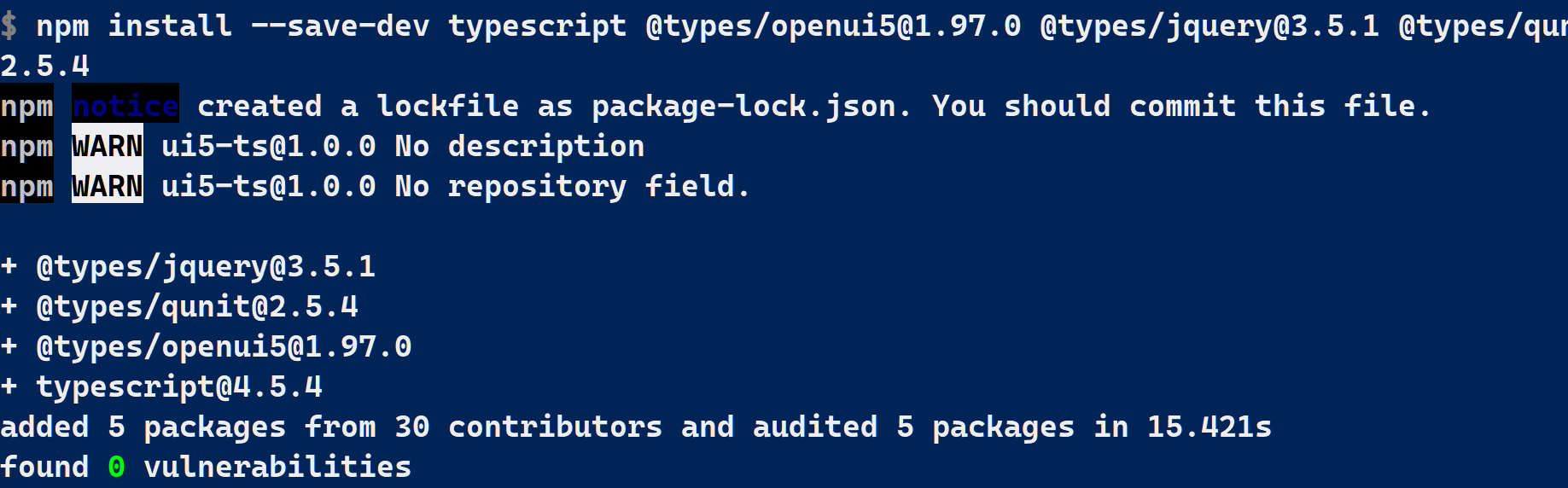 npm install --save-dev typescript @types/openui5@1.97.0 @types/jquery@3.5.1 @types/qunit@2.5.4