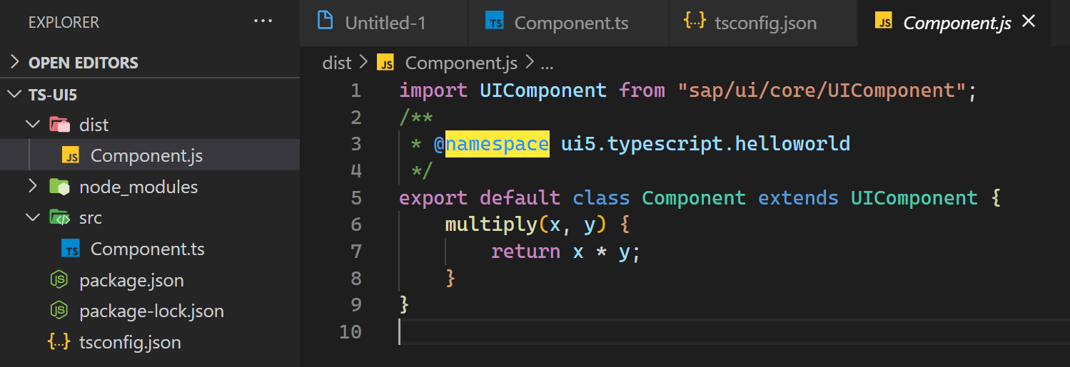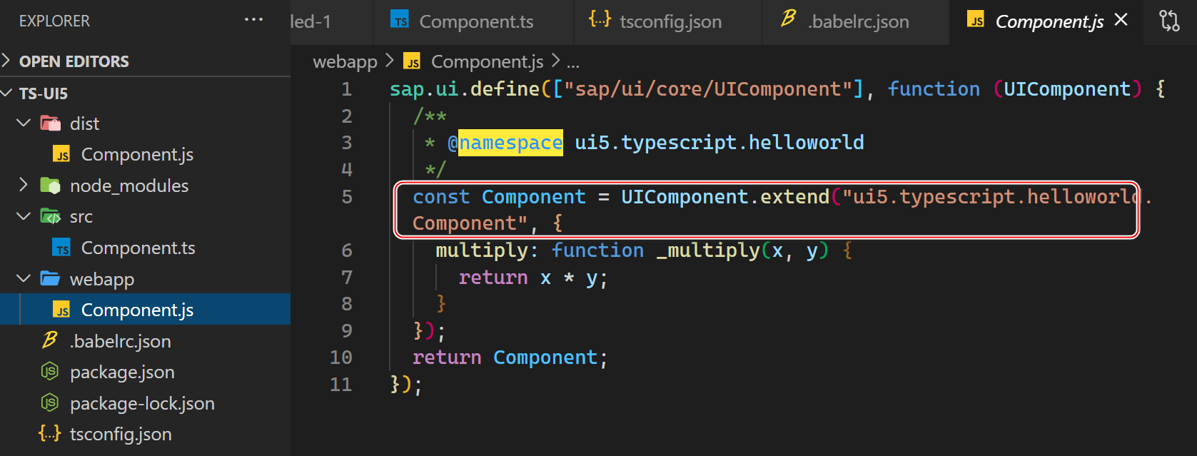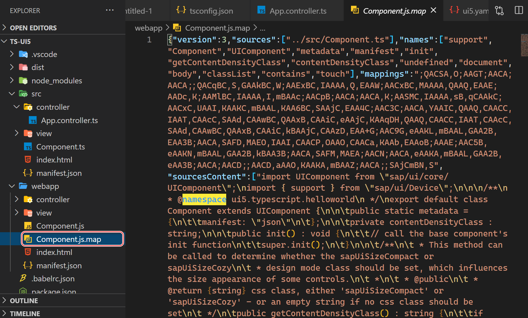转译完成后,输出文件夹 webapp 里出现了一个 Component.js, 其源代码就是 SAP UI5 开发人员熟悉的 UIComponent.extend 这种传统语法了。