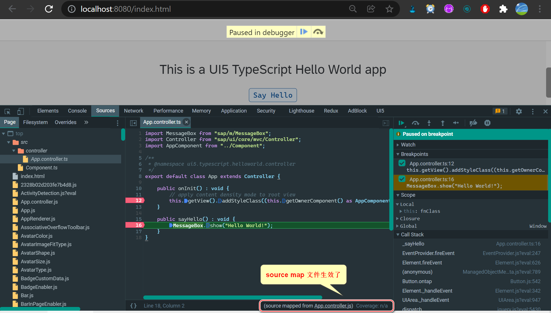 Chrome 开发者工具 Sources 标签页里打开后,看到的是原始的 TypeScript 文件,可以直接设置断点,单步调试: