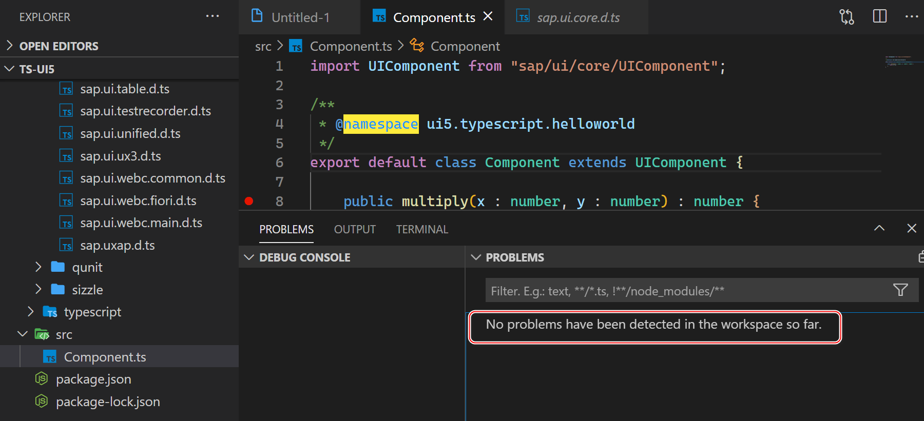 我们通过命令行 npm install 为 TypeScript 安装了针对 SAP UI5 所谓的 DefinitelyTyped(外部类型定义). SAP UI5 开发团队基于 SAP UI5 JSDoc 生成了一套 TypeScript 能够识别的外部类型定义,这样 TypeScript 可以依据这些类型定义,进行编译期的静态类型检查。