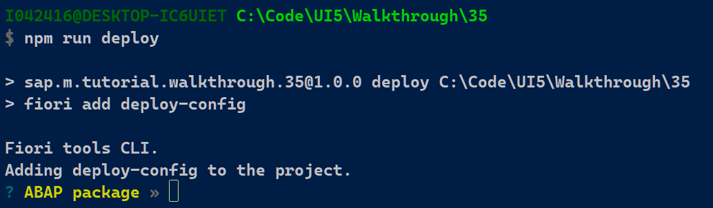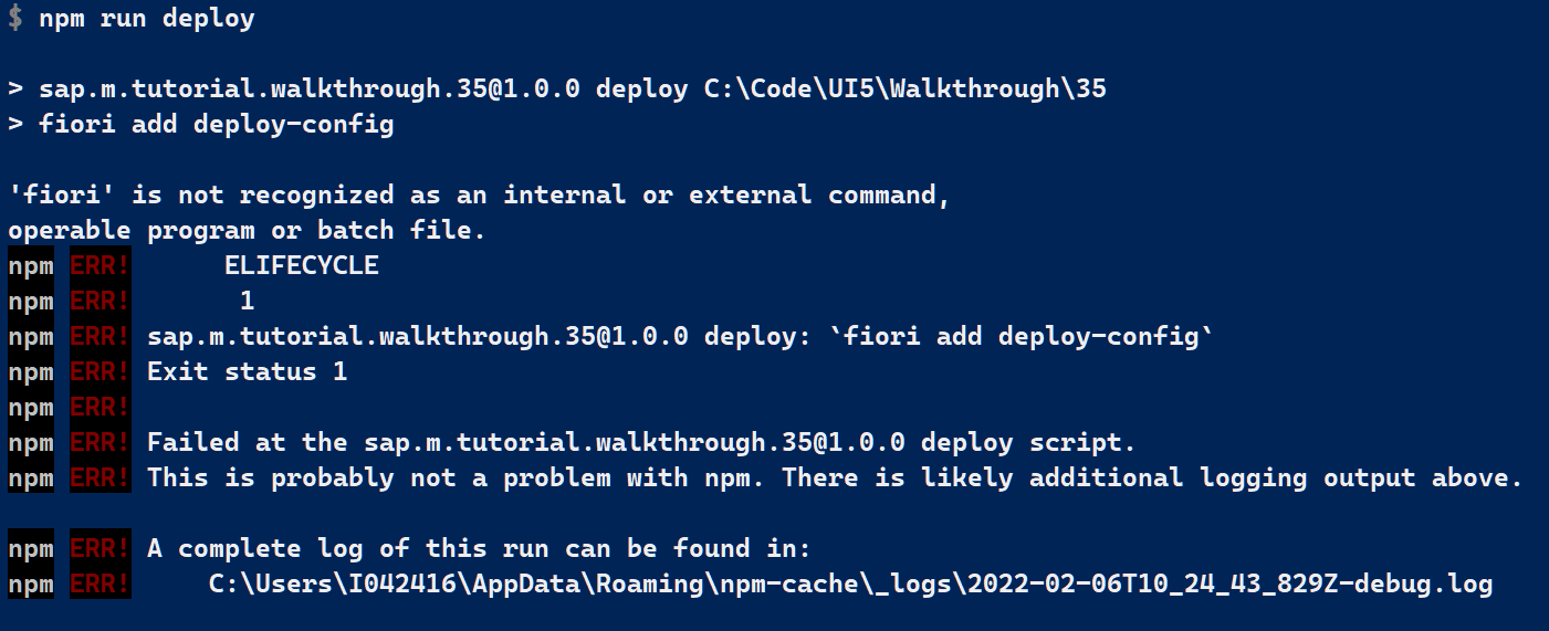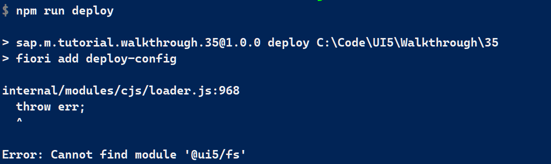 添加后运行 npm install,然后 fiori add deploy-config, 遇到新的错误消息: