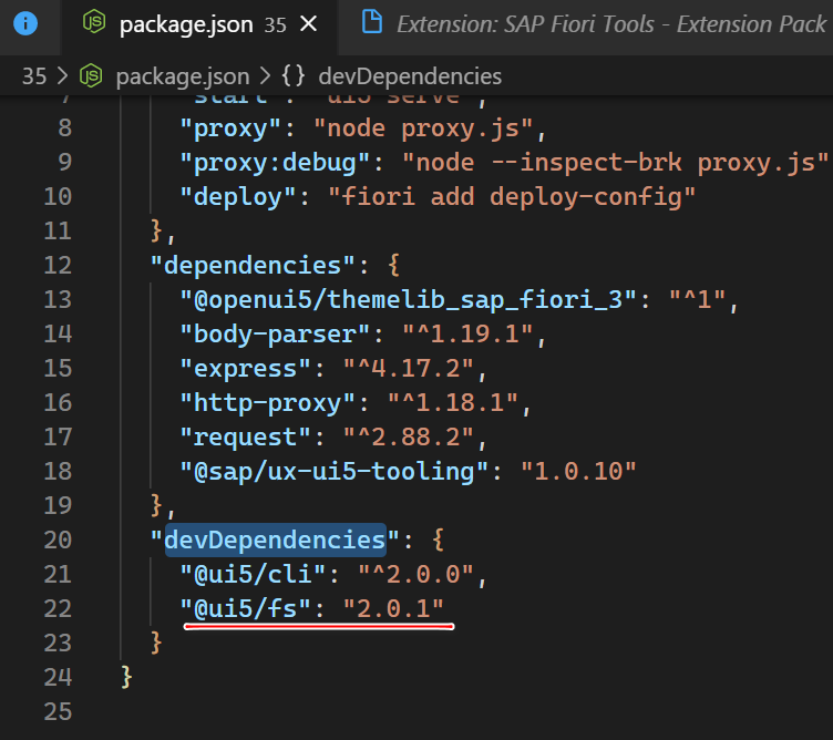 那么将 "@ui5/fs": "2.0.1" 添加到 devDependencies 区域: