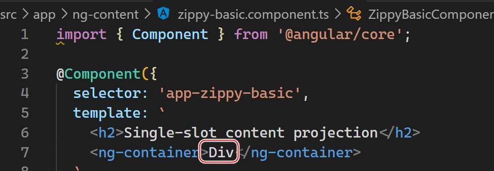 我们在提供内容投影插槽的 Component 的 ng-container 之间随便键入一些字符串,例如 DIV: