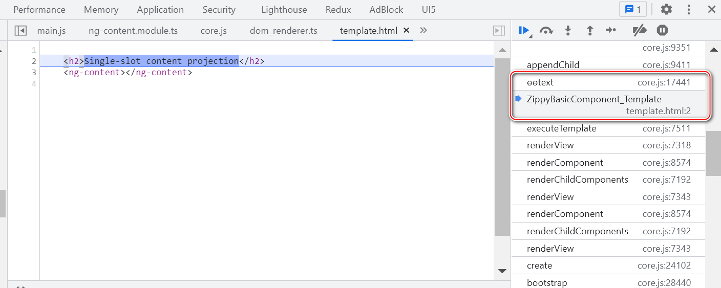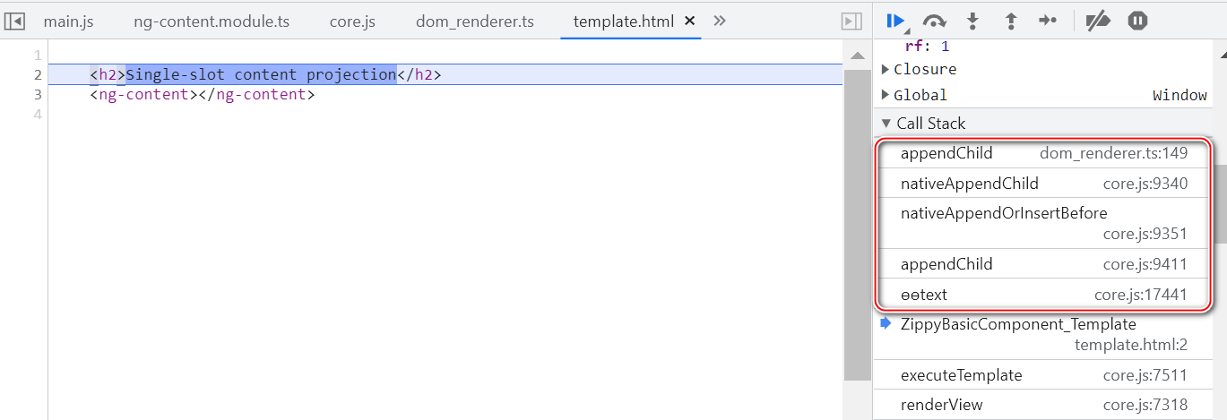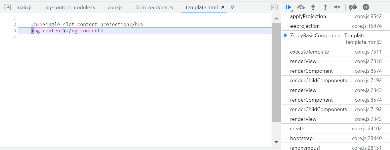 使用 ng-content 之后问题消失。这里我们可以通过单步调试的方式,搞清楚被投影的内容是如何插入到 ng-content 占位符里的。