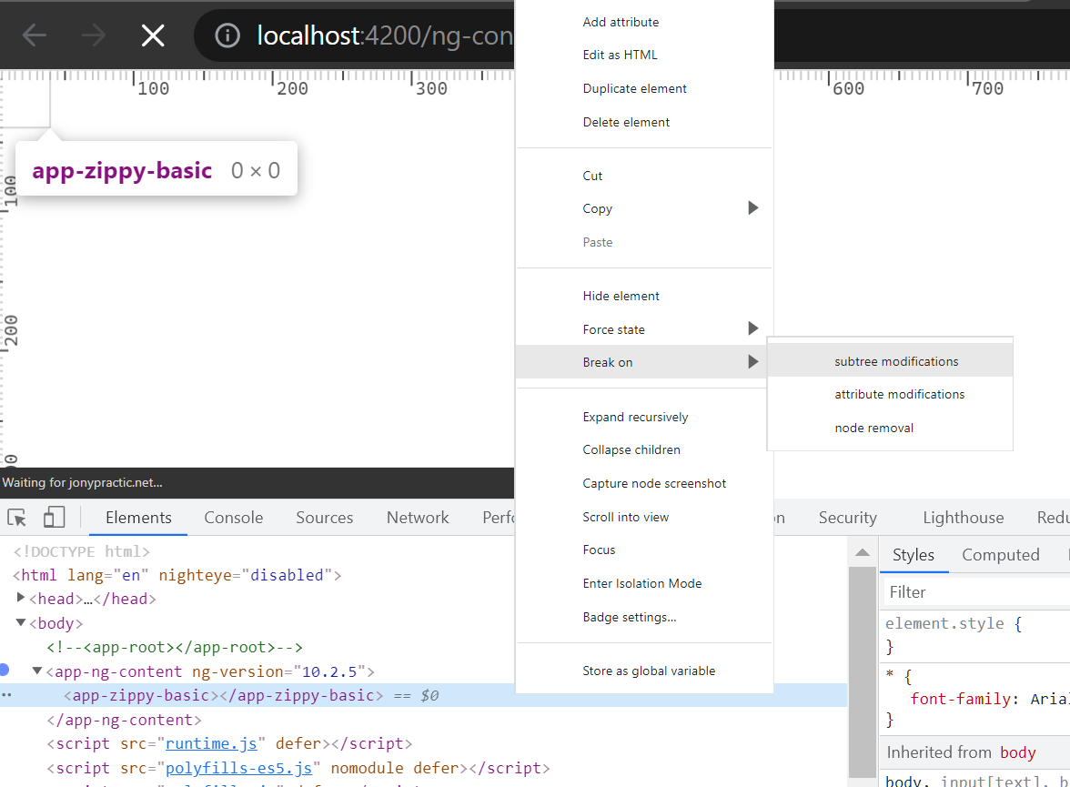 选择 app-zippy-basic,给其设置一个 dom 断点,类型为 subtree modification: