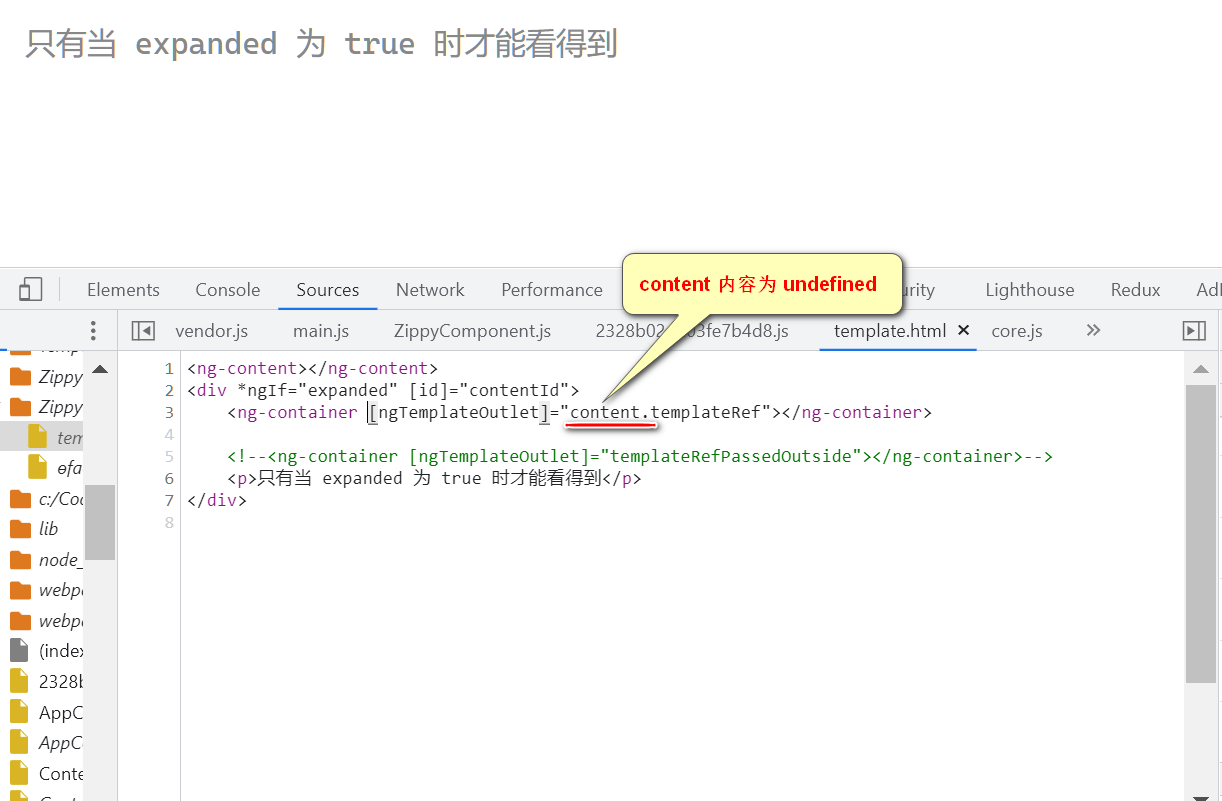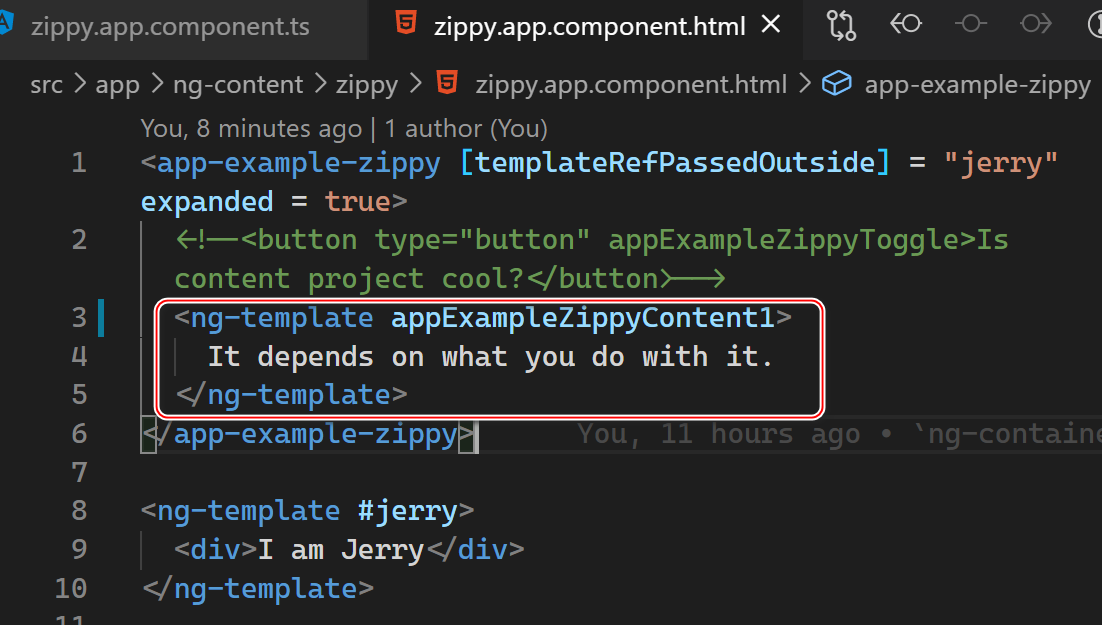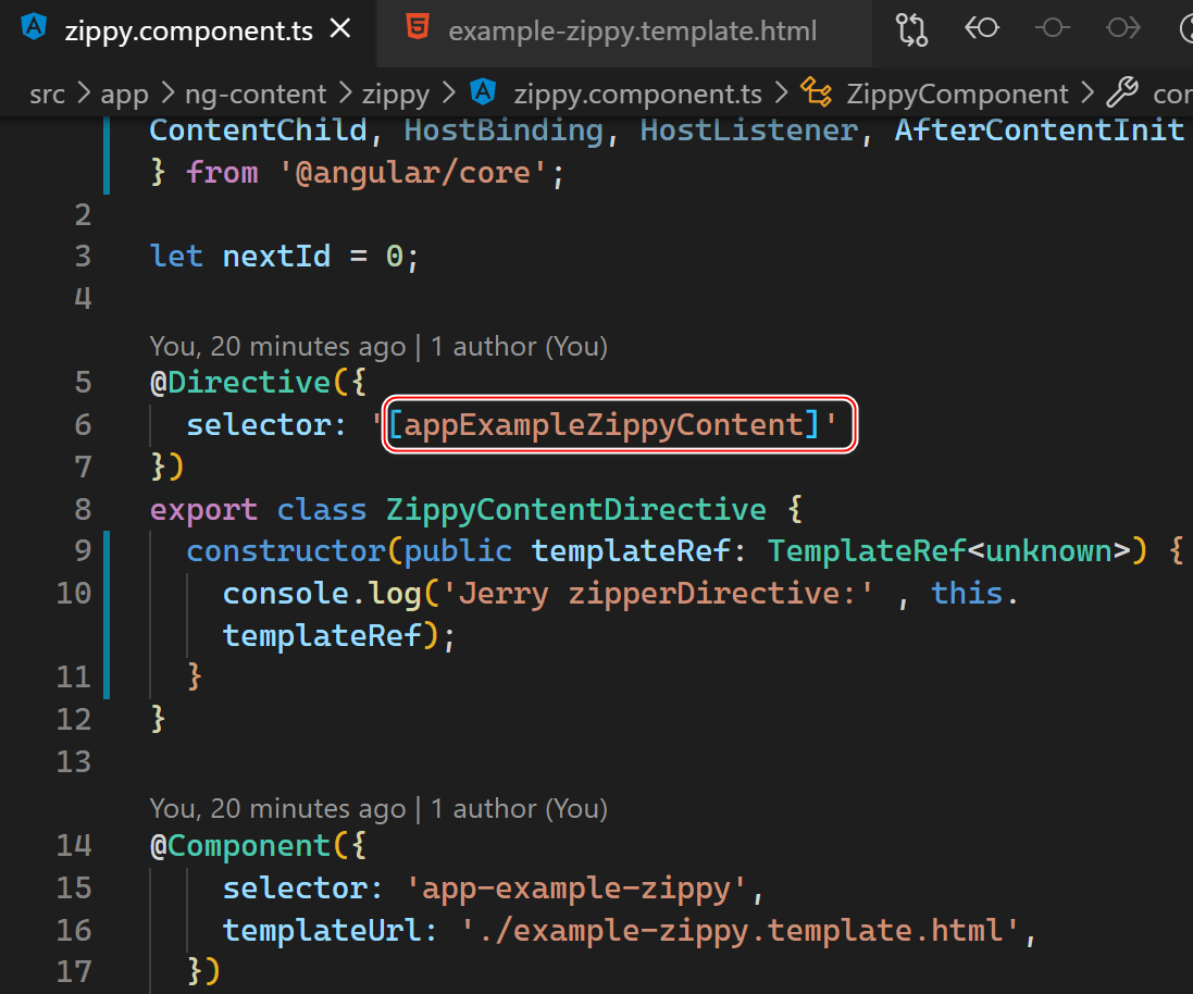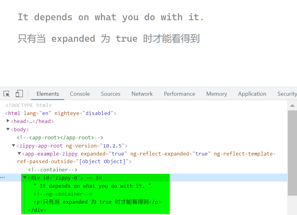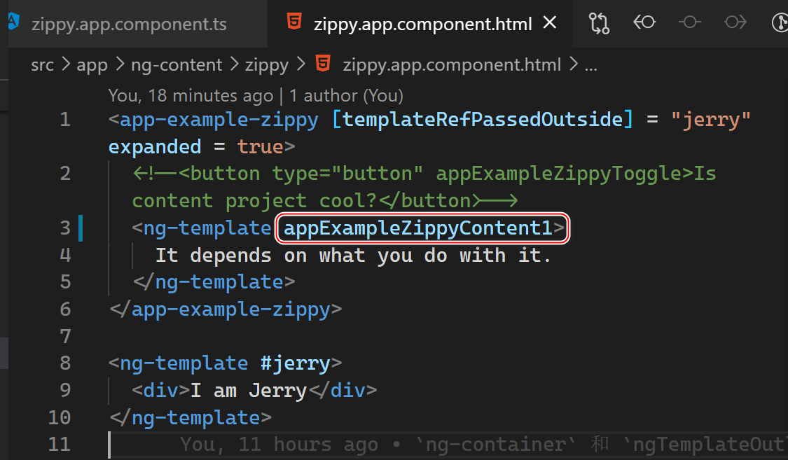 从语义上讲,消费 app-example-zippy 的 Component 的 HTML 模板里,只有有 ng-template 元素设置有自定义指令 ZippyContentDirective 对应的 attribute selector,则该 ng-template 里的内容会被自动投影到 app-example-zippy 内部。