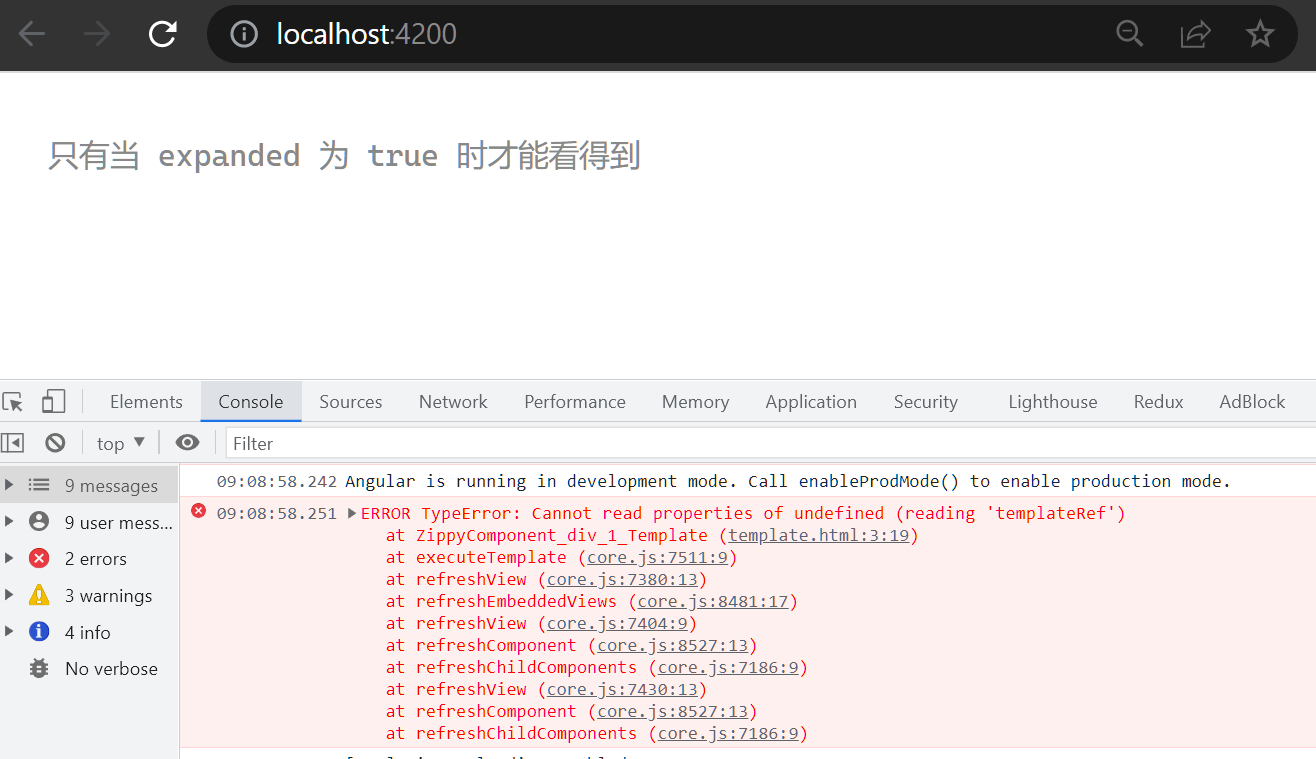 然而运行时,我们观察不到上图高亮的第四行内容,而是在 console 里看到如下错误消息: