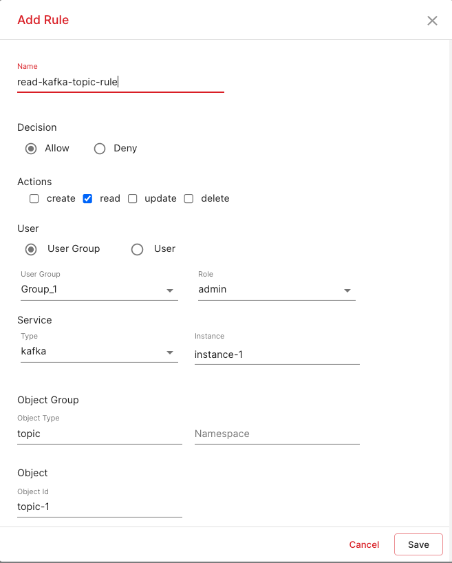 通常,最终用户使用CLI和具有层次结构(如pods/<namespace>/<pod-name>)和组织结构(如kafka用户组等)的对象。如果访问控制也不是基于相同的访问控制,它就不能通过简单性测试。在Maira中,可以定义策略规则,将用户、角色或组连接到该层次结构中的资源实例、资源类型、服务实例或服务类型。这使得您可以轻松地从非常精细的级别定义策略到非常粗略的级别。下面是显示这个过程的截图。