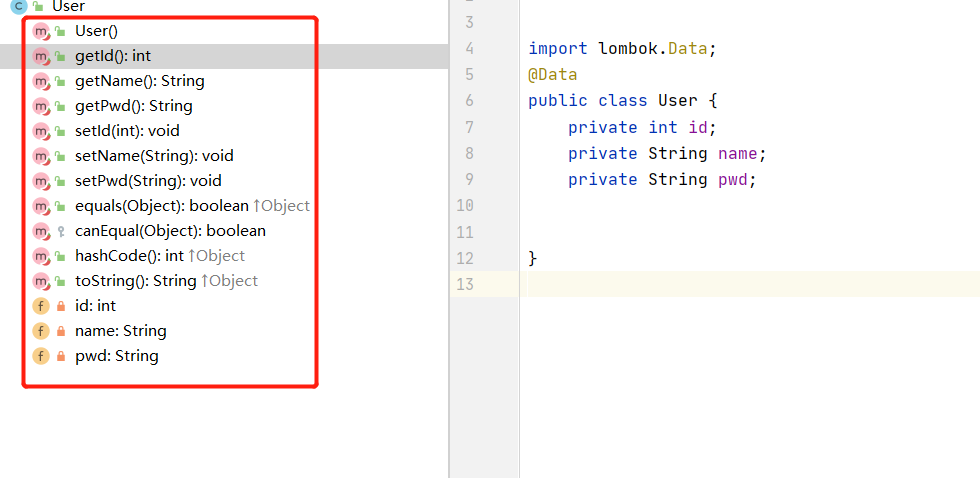 @Data: 注解在类,生成setter/getter、equals、canEqual、hashCode、toString方法,如为final属性,则不会为该属性生成setter方法。