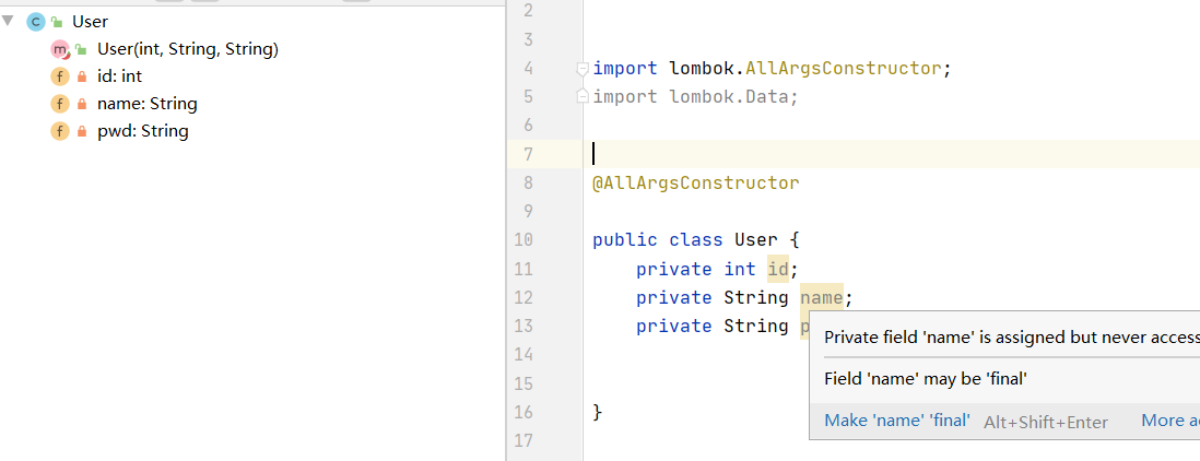 2、AllArgsConstructor,有参构造方法(但你发现你的无参构造没有了,别慌)