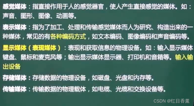 显示媒体(表现媒体) :表现和获取信息的物理设备。如:输入显示媒体键盘、鼠标和麦克风等;输出显示媒体显示器、打印机和音箱等。输入输出设备