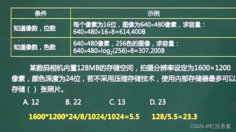每个像素为16位,图像是640*480像素=640*480*16(色位)/8=614400b位,那么题中:1600*1200*24/8除以2个1024等于5.5兆,那么一共128兆,128/5=23.3张,也就是23张。