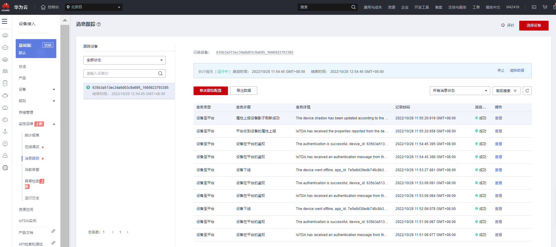 在消息跟踪导航菜单栏里,能观察到所有通过在线调试工具,从设备模拟器向 IoT 平台推送的消息负载明细。