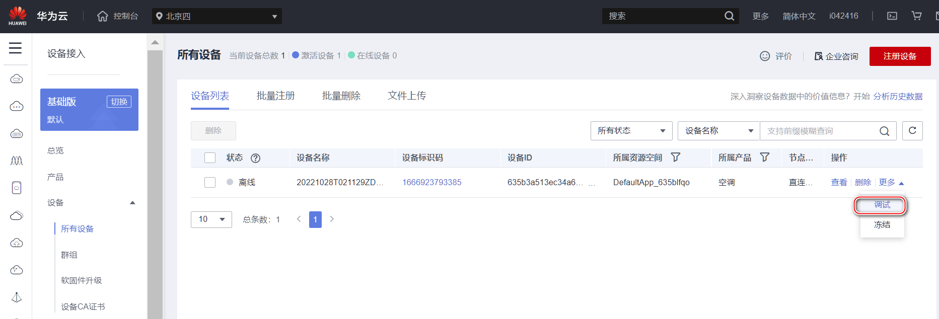 我们在所有设备菜单里,找到这个 IoT 平台帮我们创建的虚拟设备,选择调试: