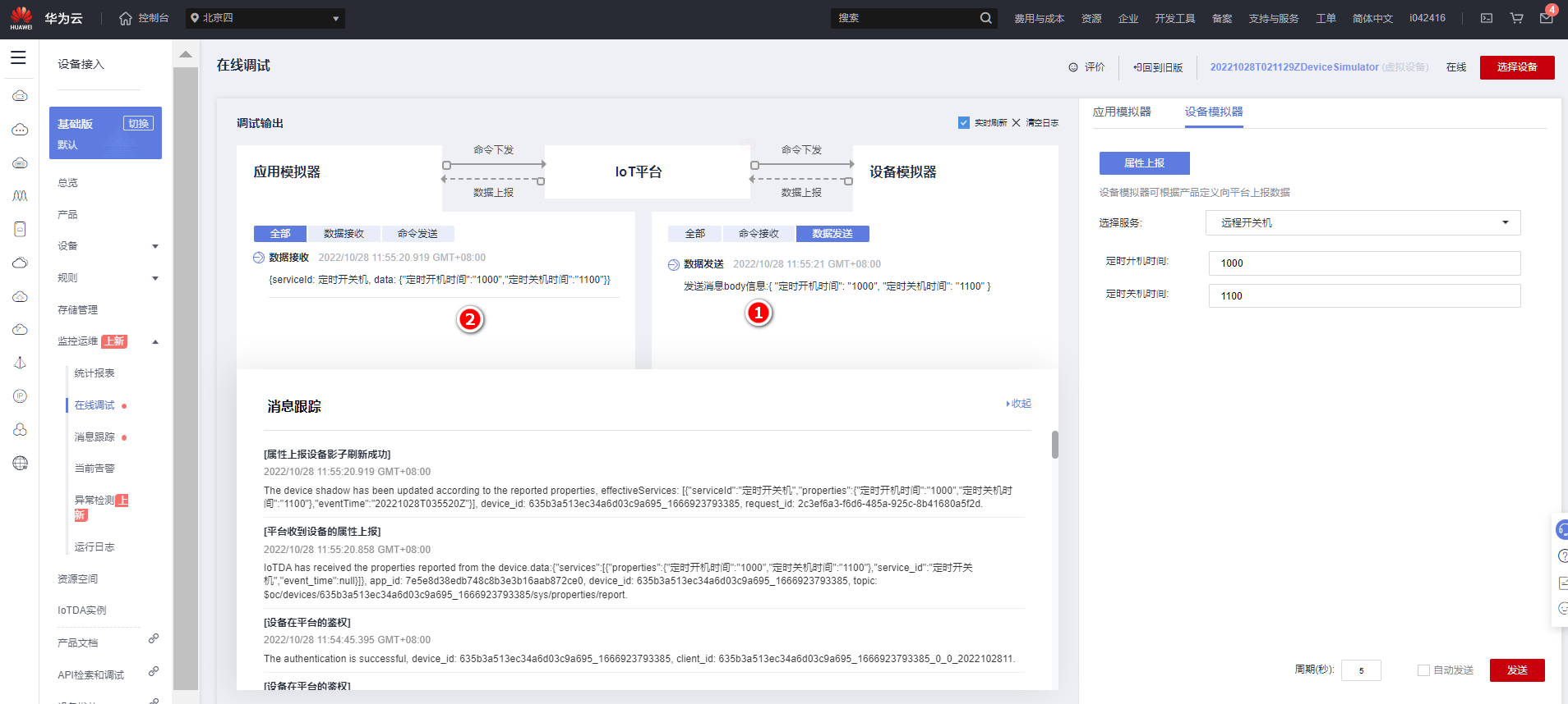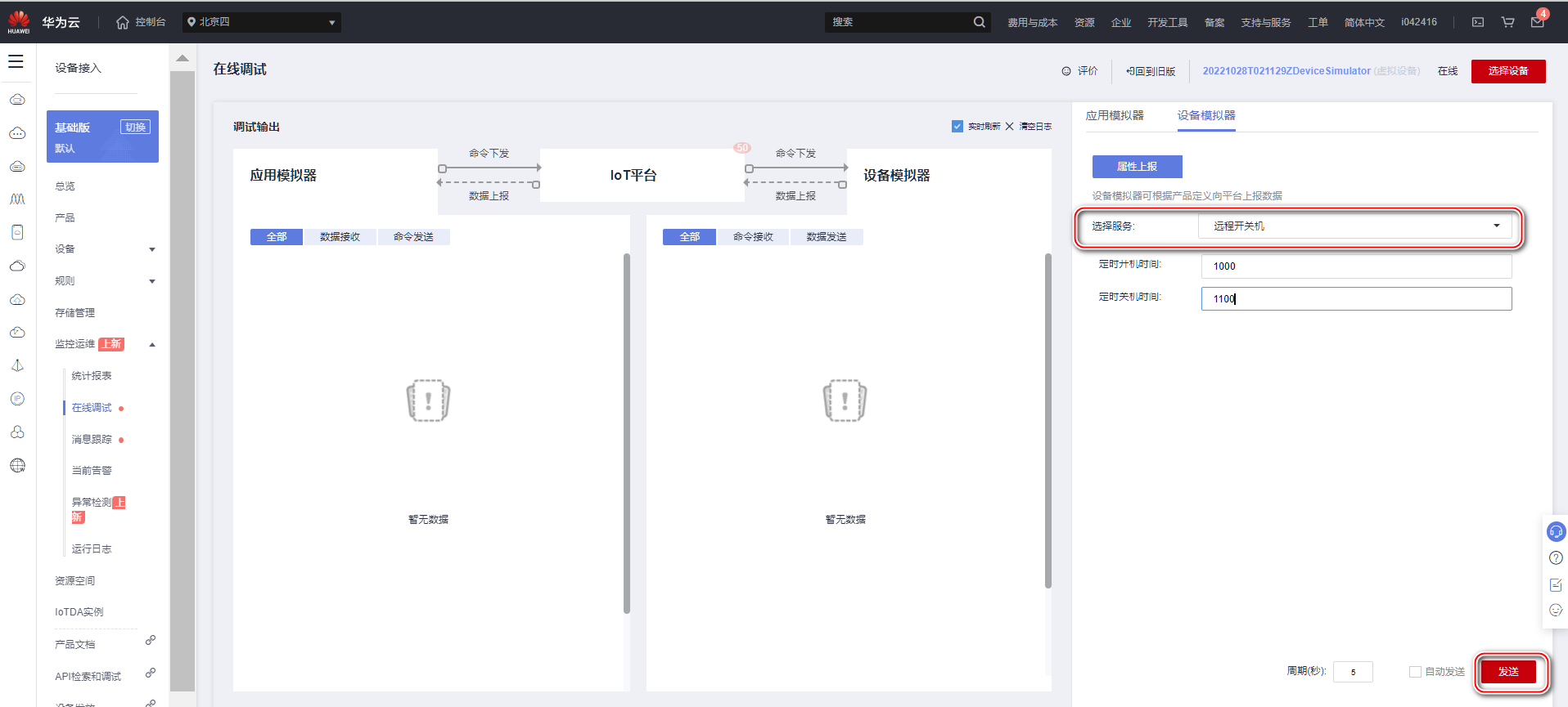 切换到设备模拟器标签页,选择我们之前创建好的远程开关机服务,给设备维护好定时开机时间和定时关机时间,然后点击发送按钮: