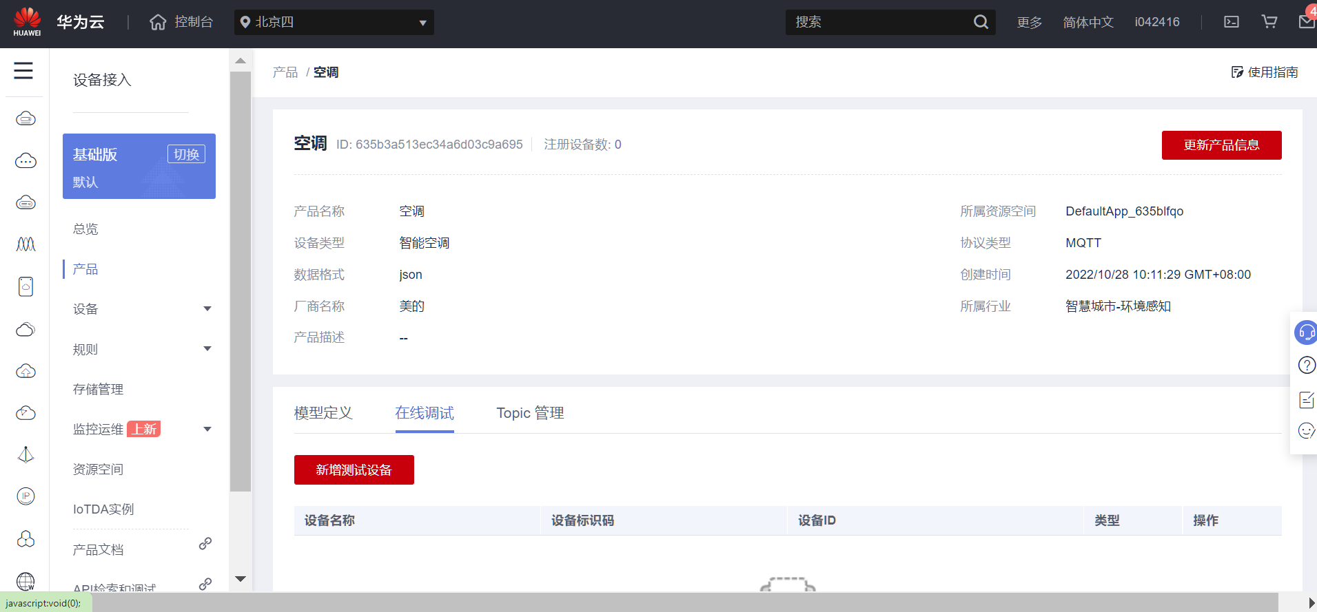 产品模型创建完毕后,我们可以通过华为云 IoT 平台提供的工具,进行简单的在线调试。选中我们之前创建的产品模型,切换到在线调试面板,点击新增调试设备按钮: