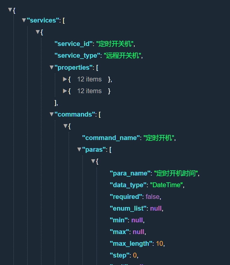 设备的服务和自定义属性定义完毕之后,可以点击导出按钮,以 JSON 格式输出我们在华为云 IoT 平台里创建的模型信息: