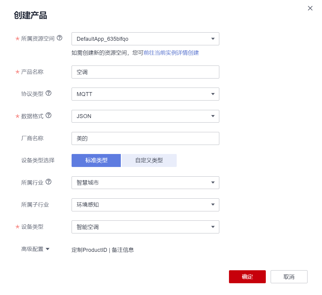 我们新建一个产品模型,描述一种智能空调设备,设备类型选择 智能空调:
