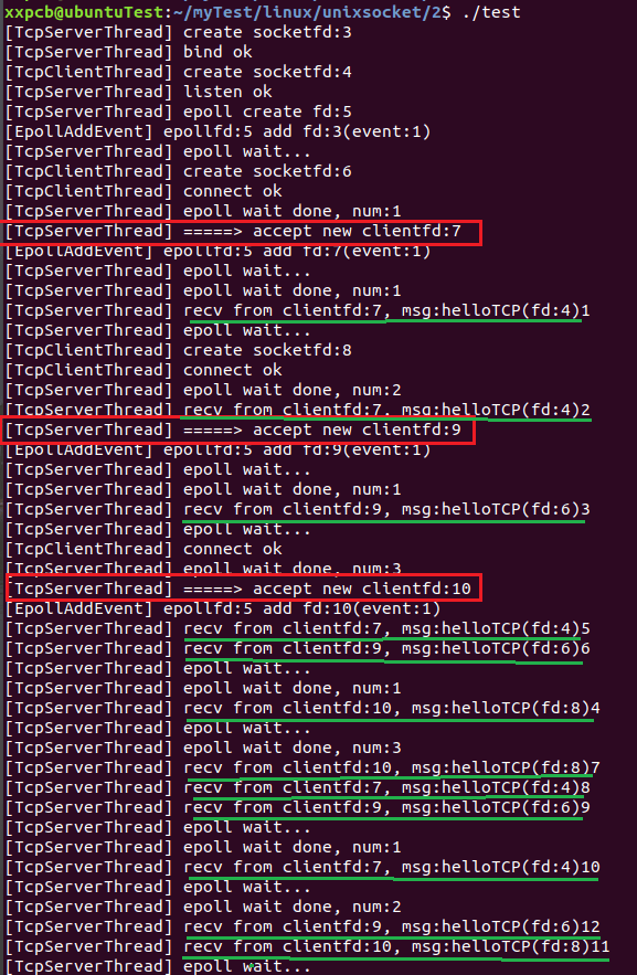 [TcpServerThread] recv from clientfd:10, msg:helloTCP(fd:8)11